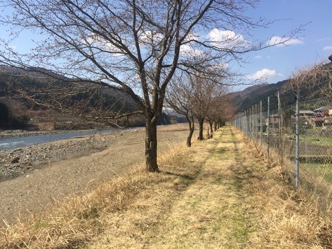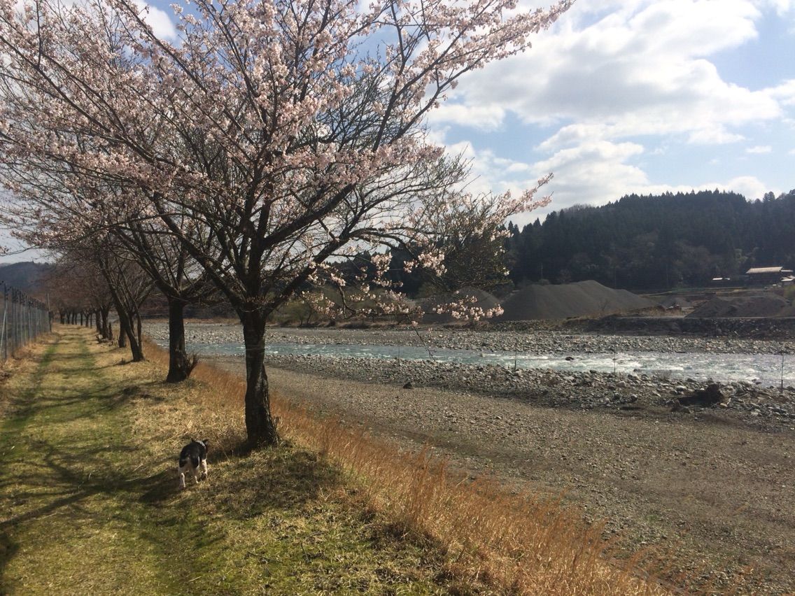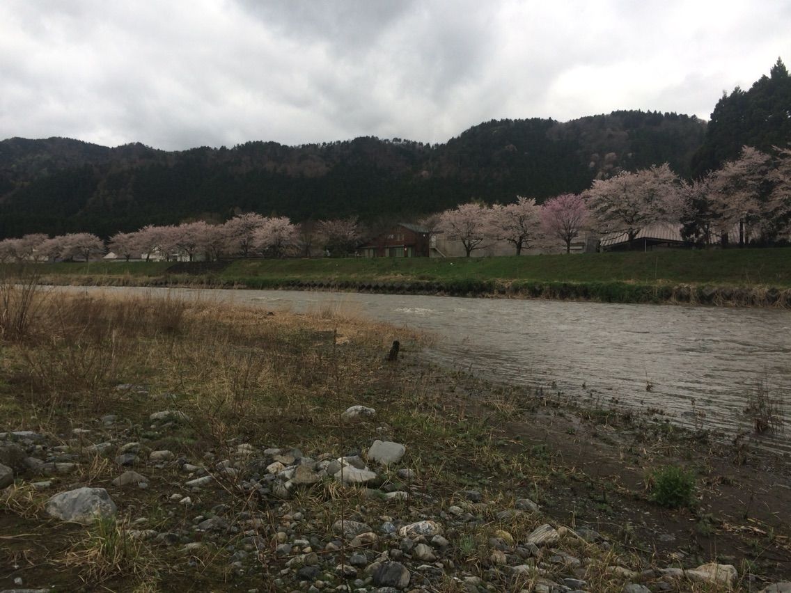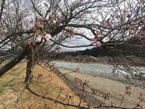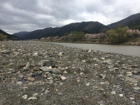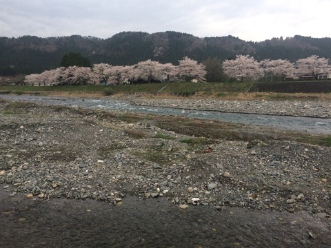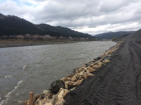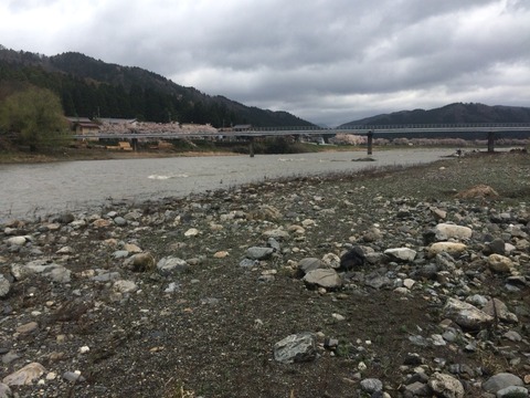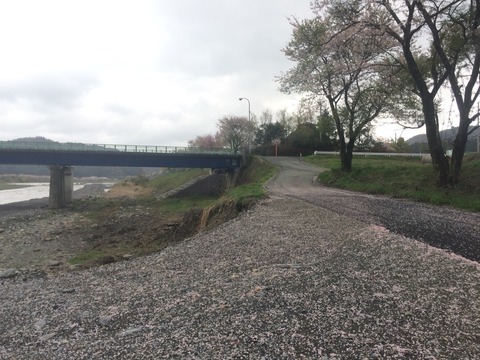 対岸の道の駅前の桜並木も昨晩の豪雨と強風で散って景色が変わりました。