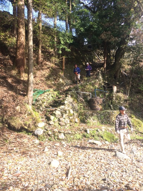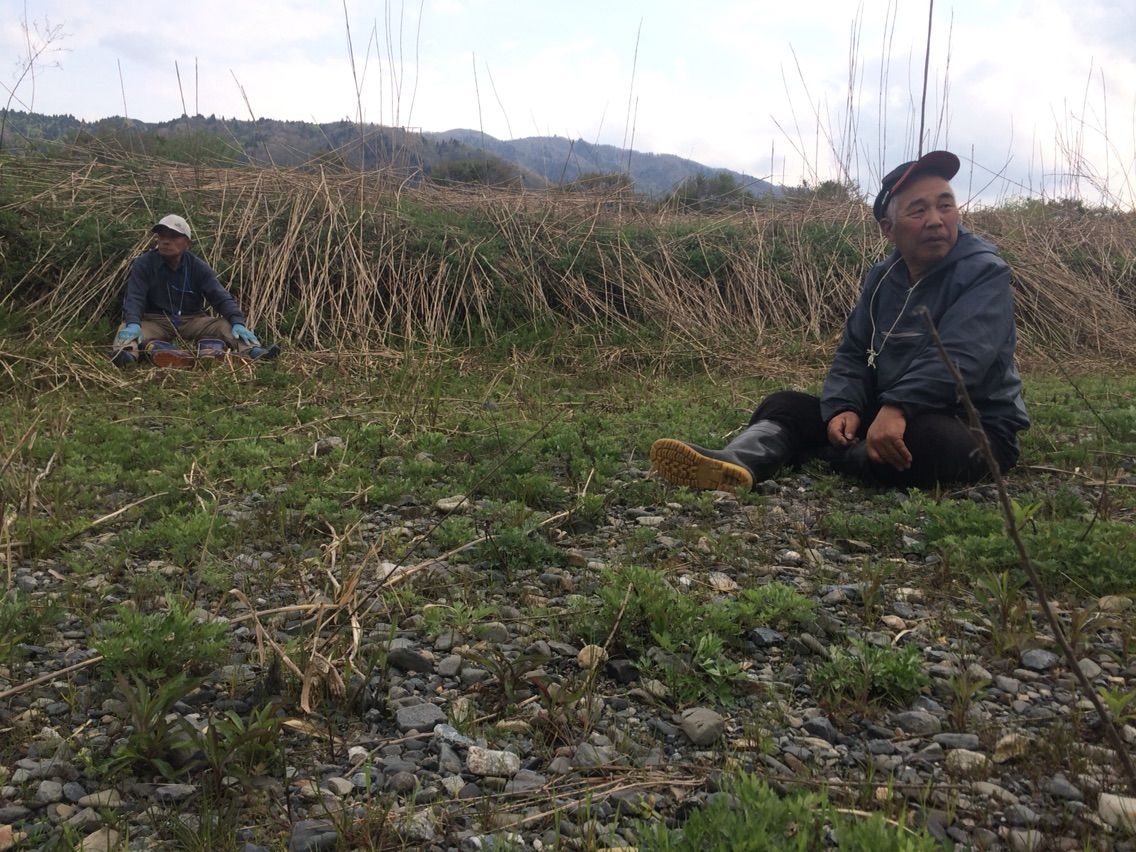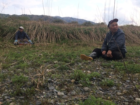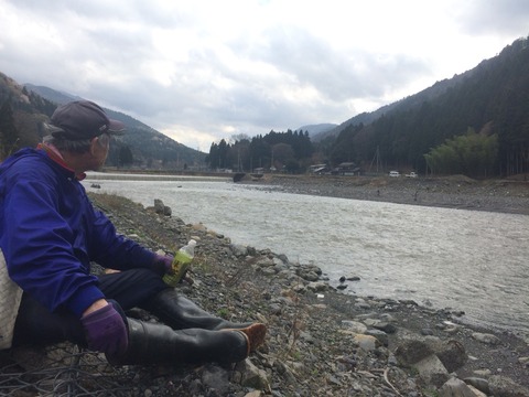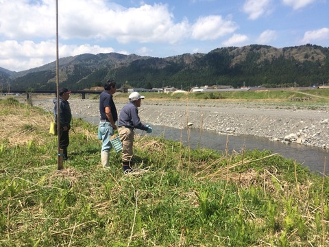 合流すると既に大野堰堤まで来て休憩中でした。対岸チームも頑張り屋さん揃いで大野堰堤まで来られています。(組合長、酒井さん、兼松さん、橋本さん、いずれの方も漁協役員の方です。)