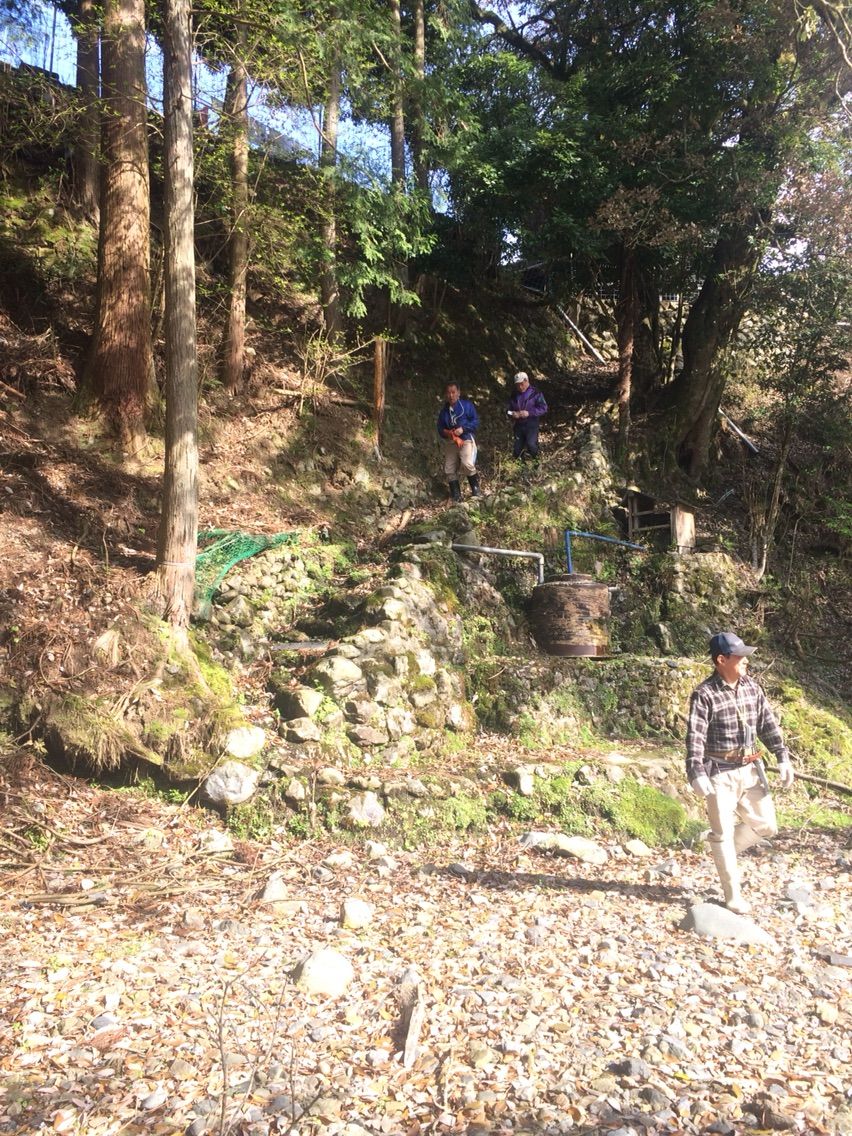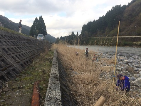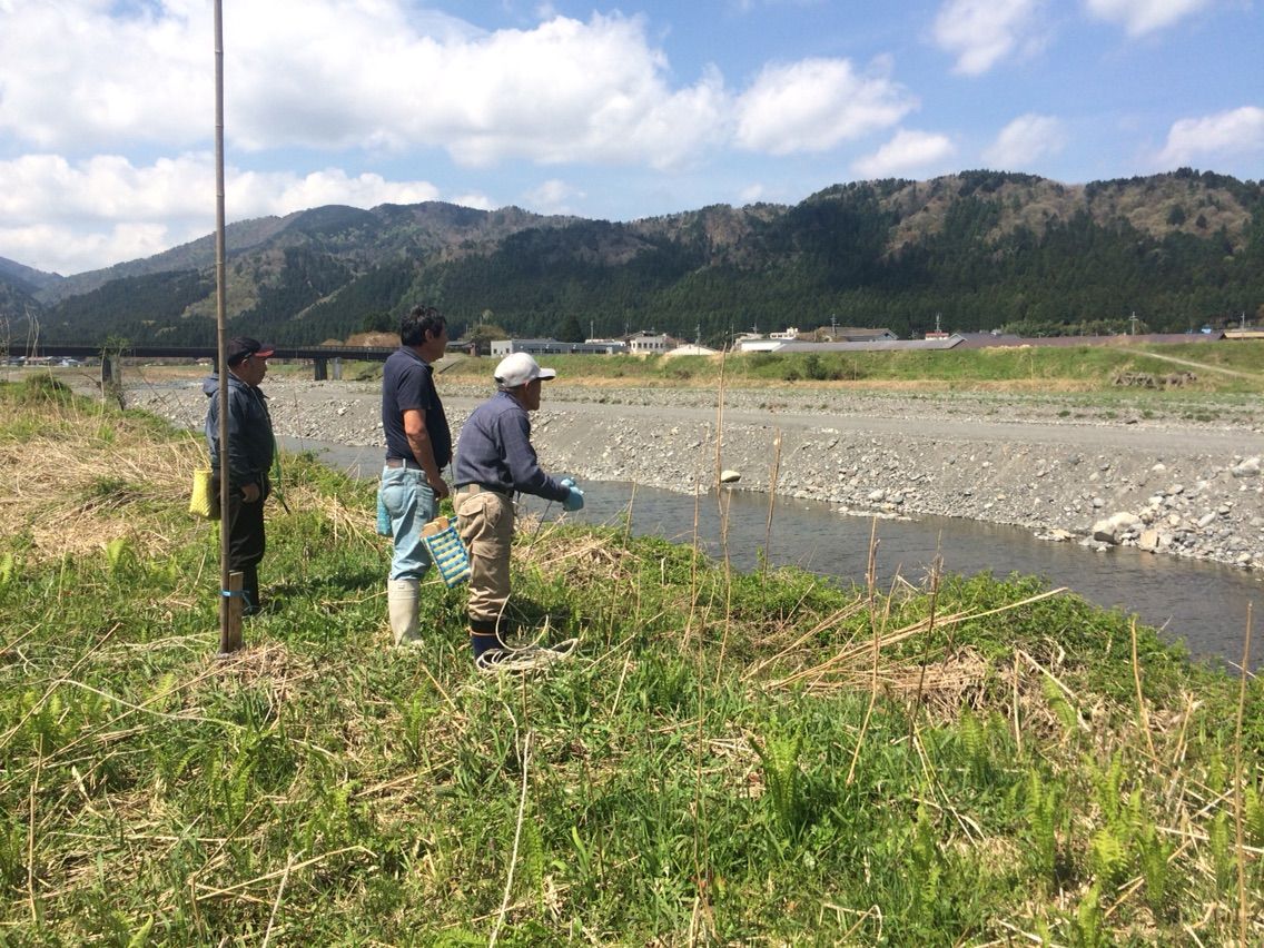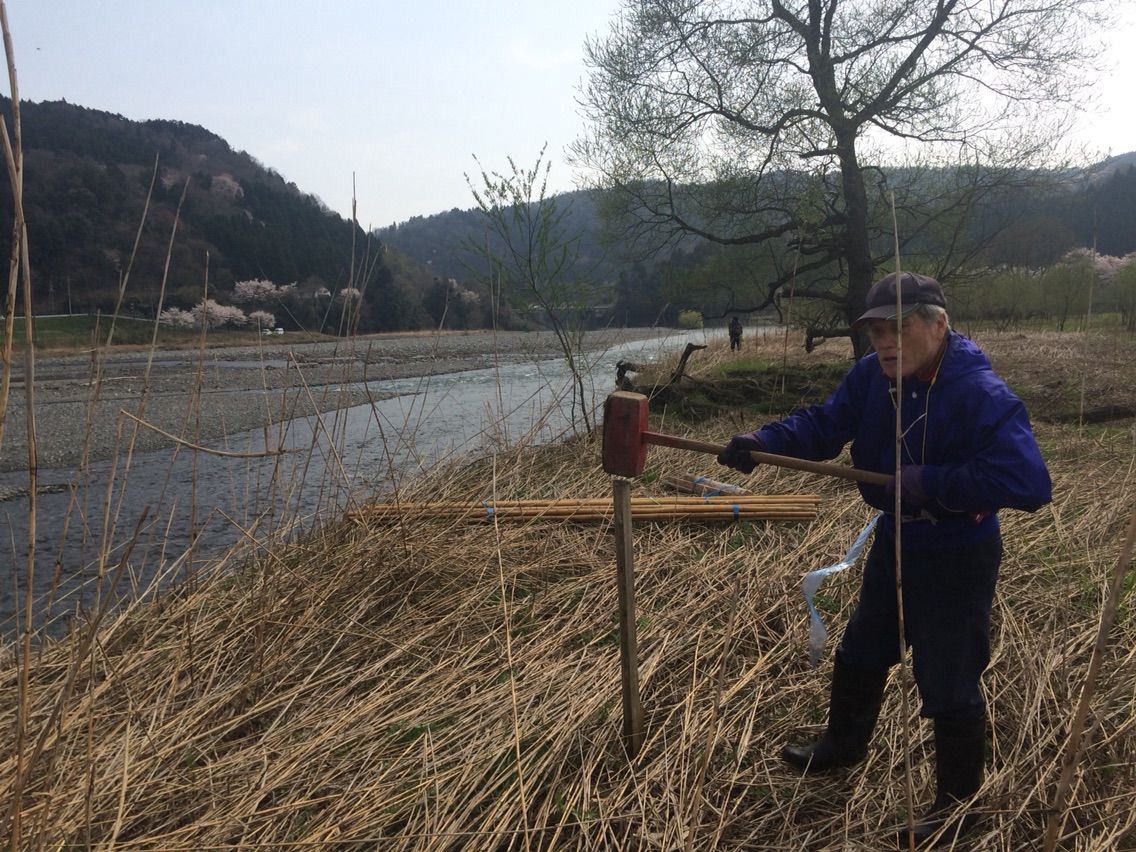 種鮎の放流を来月に控え、川鵜除けのテグス張りに参加してきました。