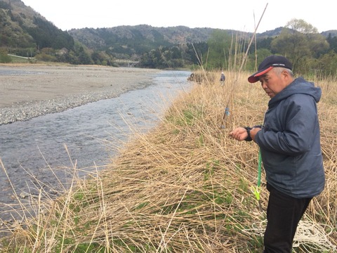 今は川を横切る様にロープ(約200m、川幅の2倍程度は必要)を張り、そのロープにテグスをくくり交互に引っ張り、テグスを対岸に渡して行きます。その時にロープを川の流れに流したり、ロープとテグスが絡まない様に注意が必要です。