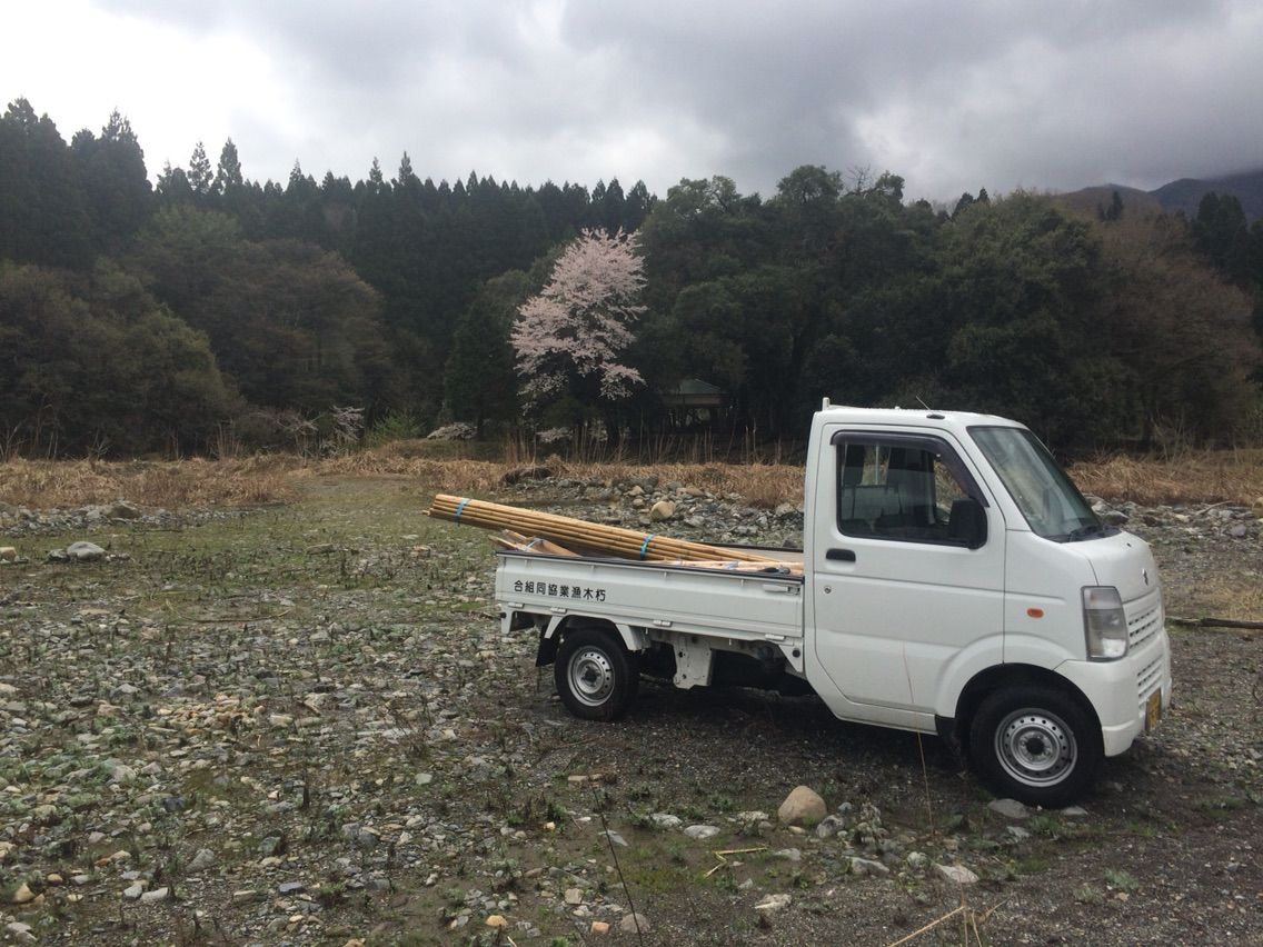 打ち込んだ杭にテグスを縛る竹を固定していきます。竹を運んでいるのは坂本さん。