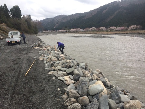 まずは高岩橋から上流に向かって杭を打ち込んでいきます。