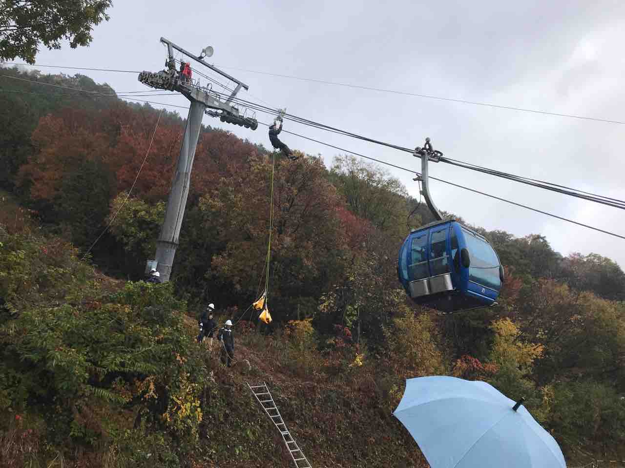 午後は山麓にてゴンドラの救助訓練がありました。リフト従業員の私は見学でしたが、雨の降る中ご苦労様です。