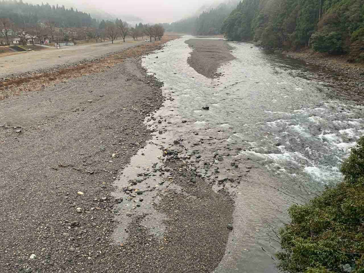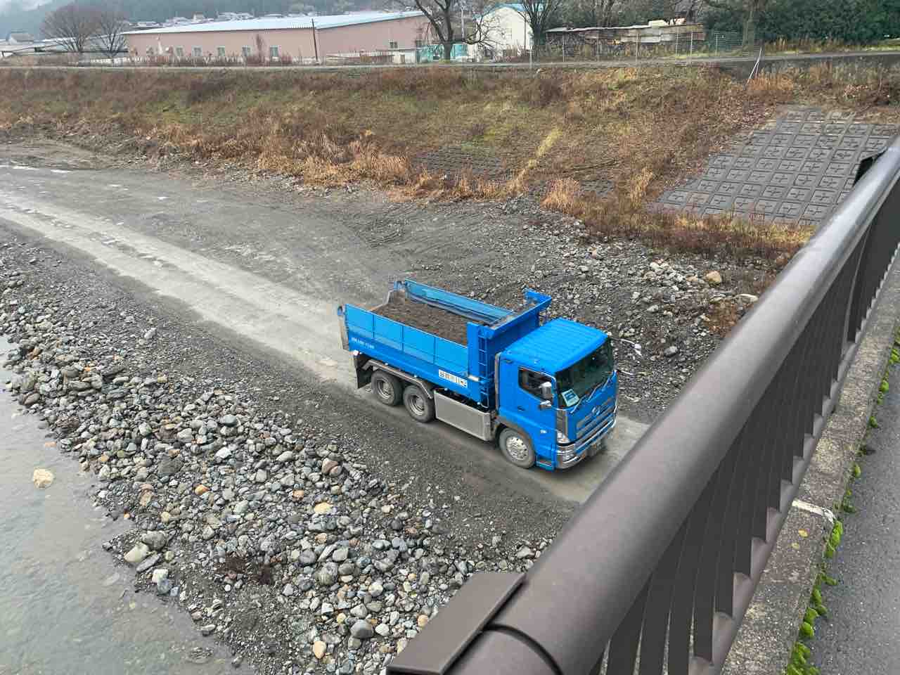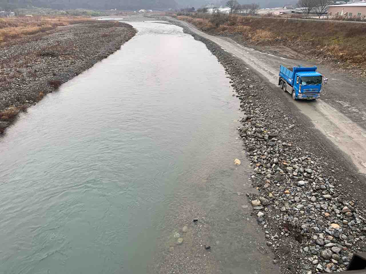 下流部の高岩橋上流の河原で治水工事が実施されています。堆積した砂をダンプが運び出しています。