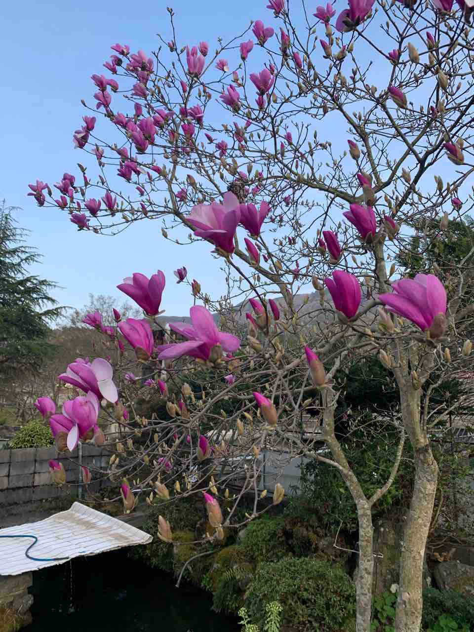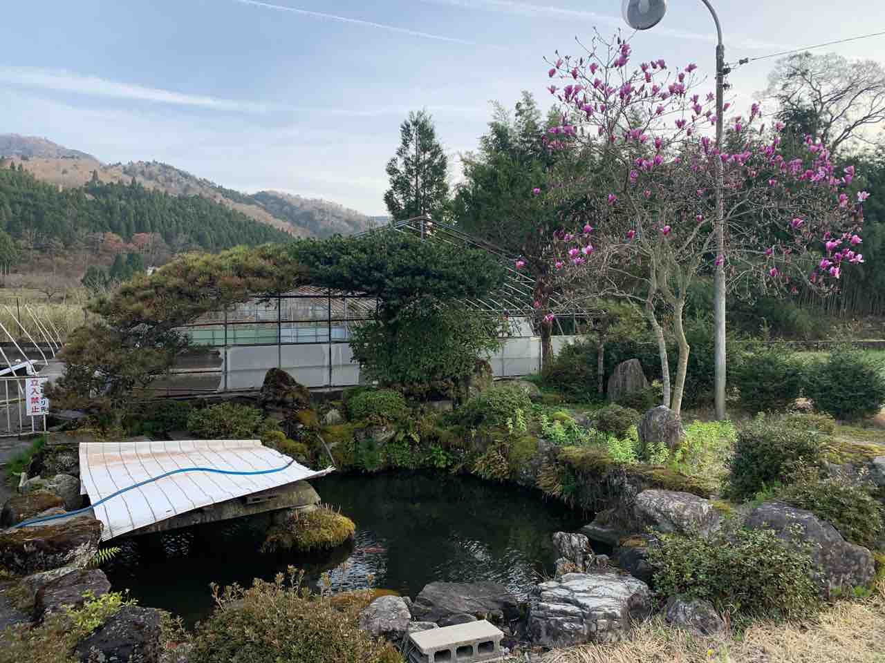 錦鯉が泳ぐ池の辺りのモクレンも咲きかけて