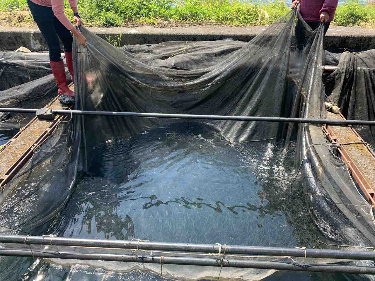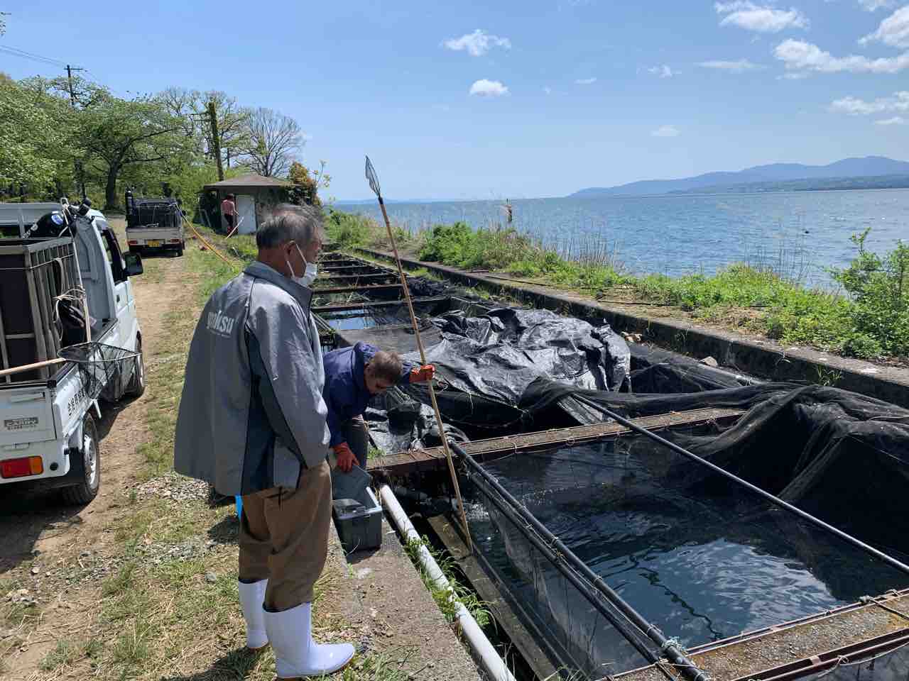 13:00に奥琵琶湖の海津漁協の蓄養池到着