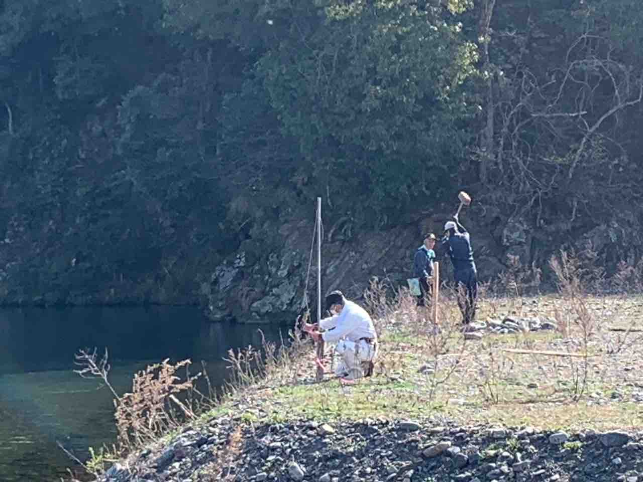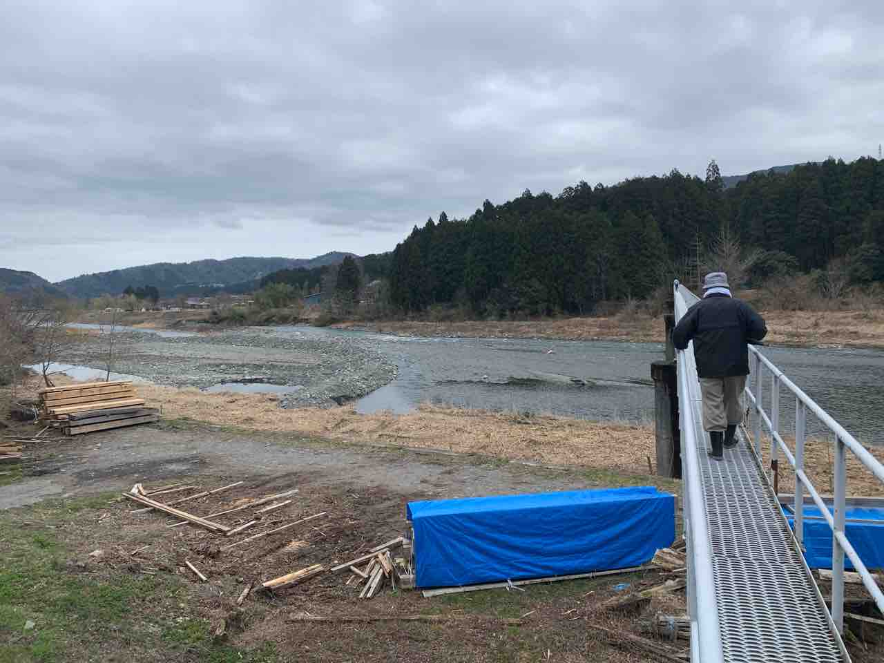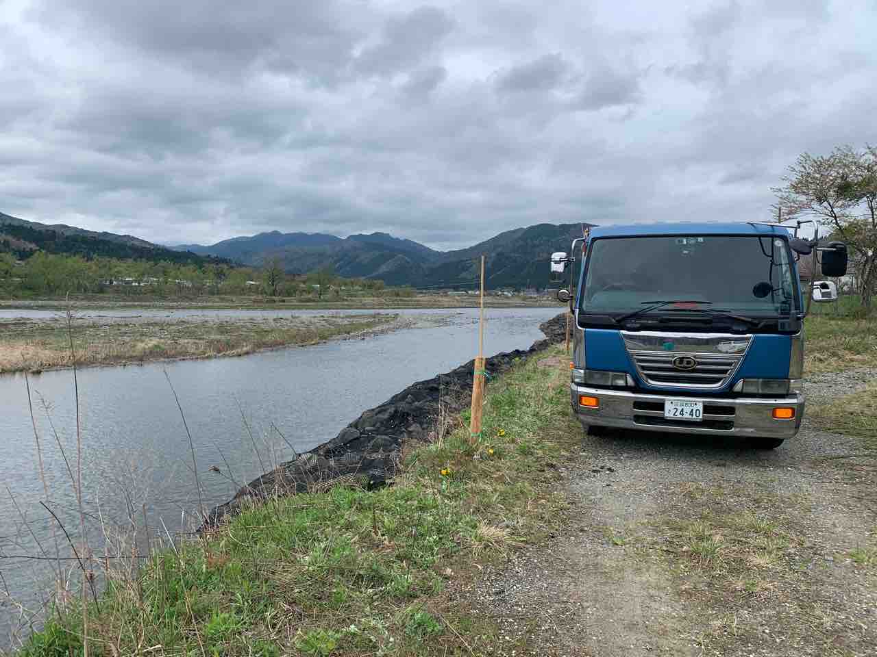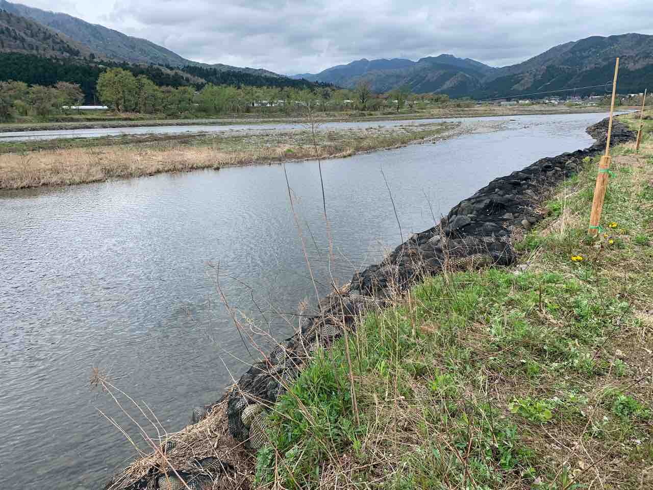 右岸左岸共に堤防の破損部分をテトラで保護して土砂を積み上げる計画になっています。