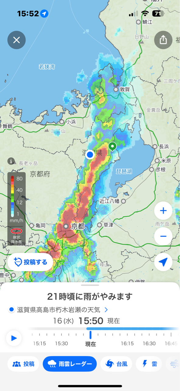 気象レーダーでは線状降水帯を思わせる様に