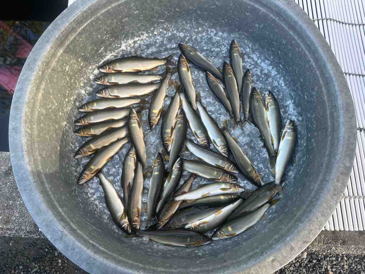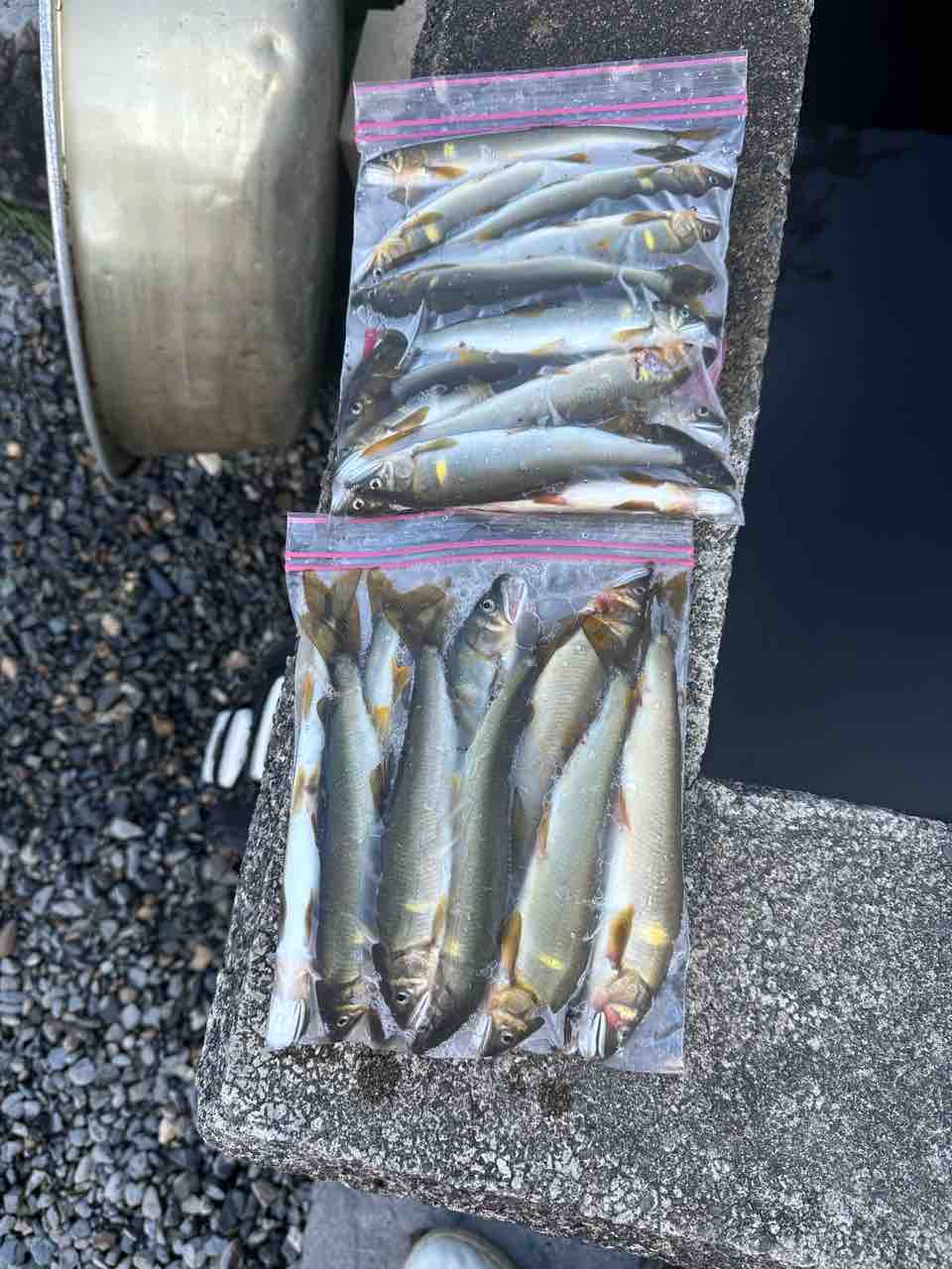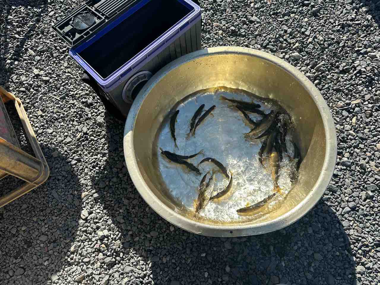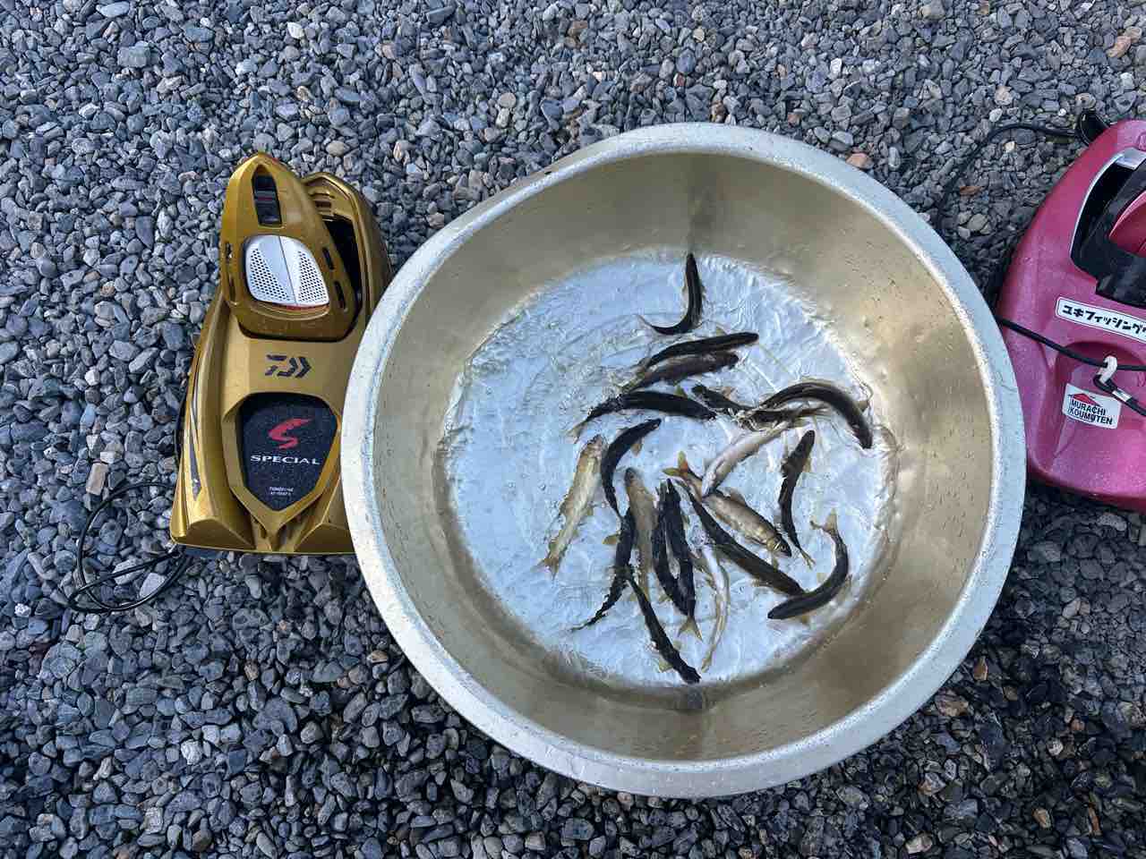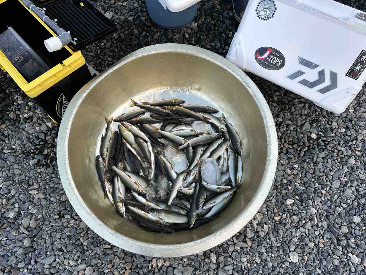 最後は小川あたりの岩盤やチャラ瀬狙いでぼちぼち釣れましたが、さすがに3連休の真ん中。