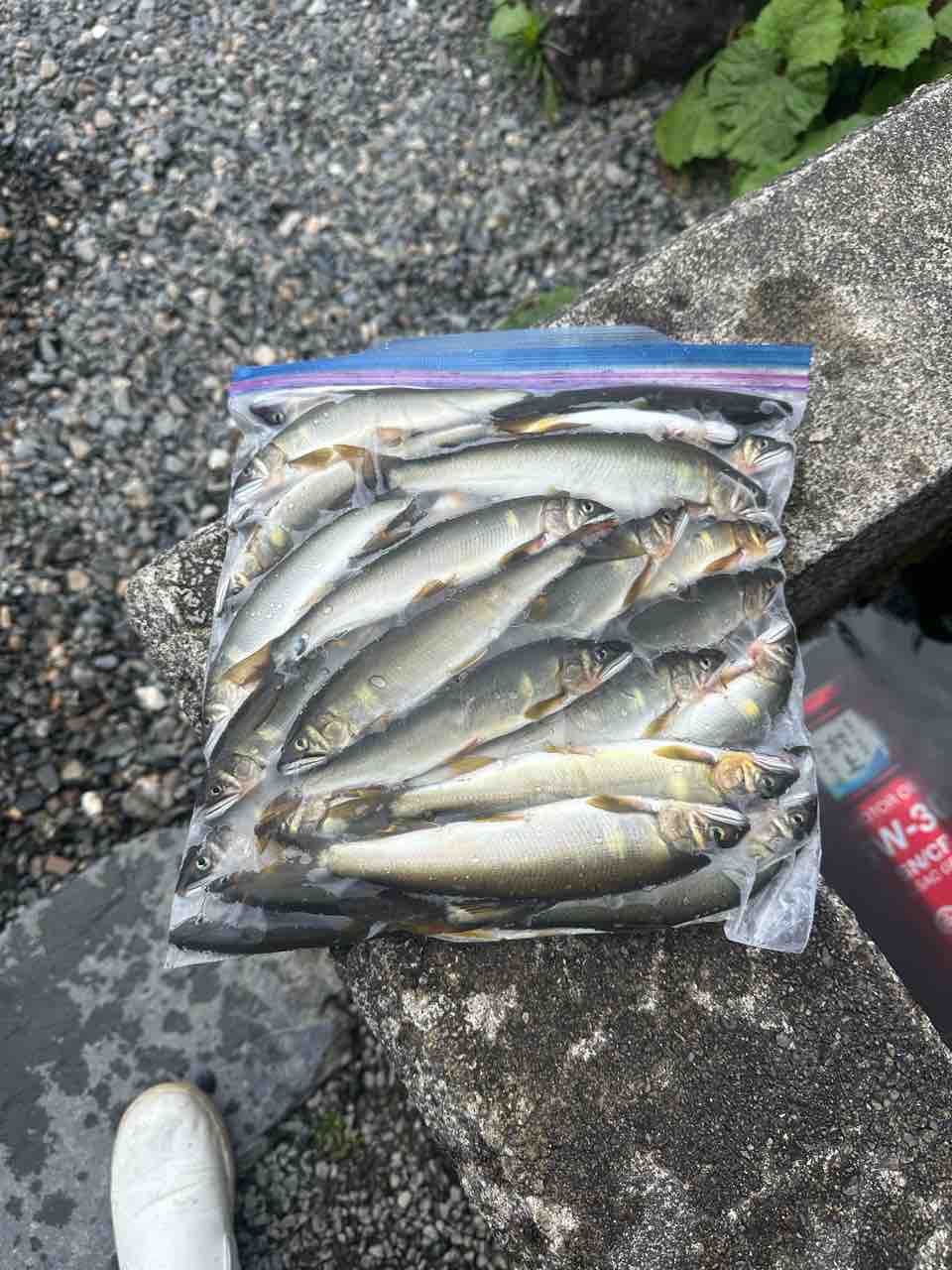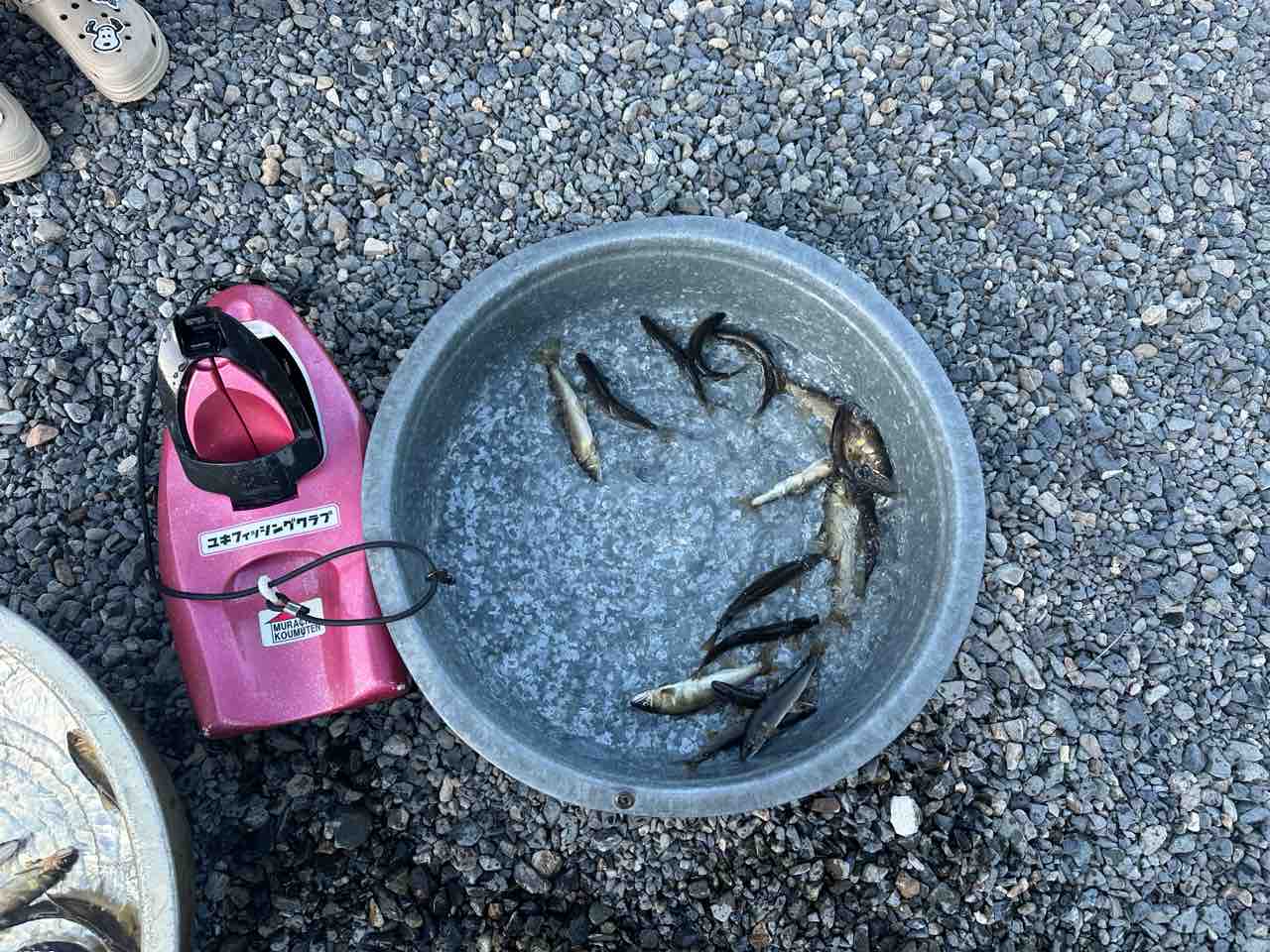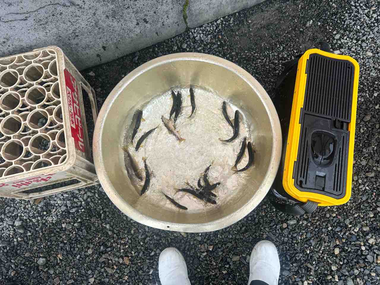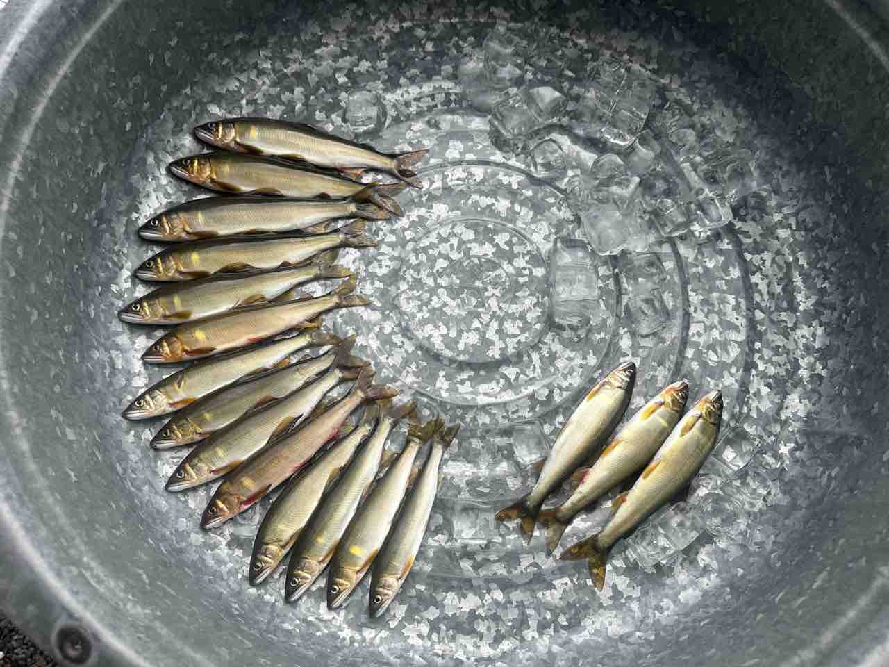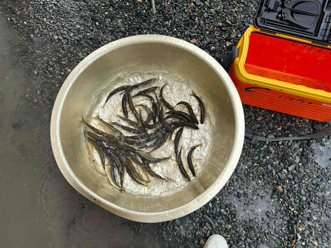 最後は小川あたりの岩盤やチャラ瀬狙いでぼちぼち釣れましたが、さすがに3連休の真ん中。