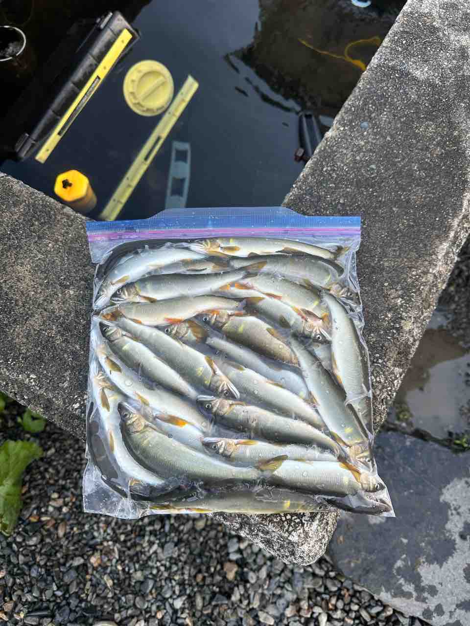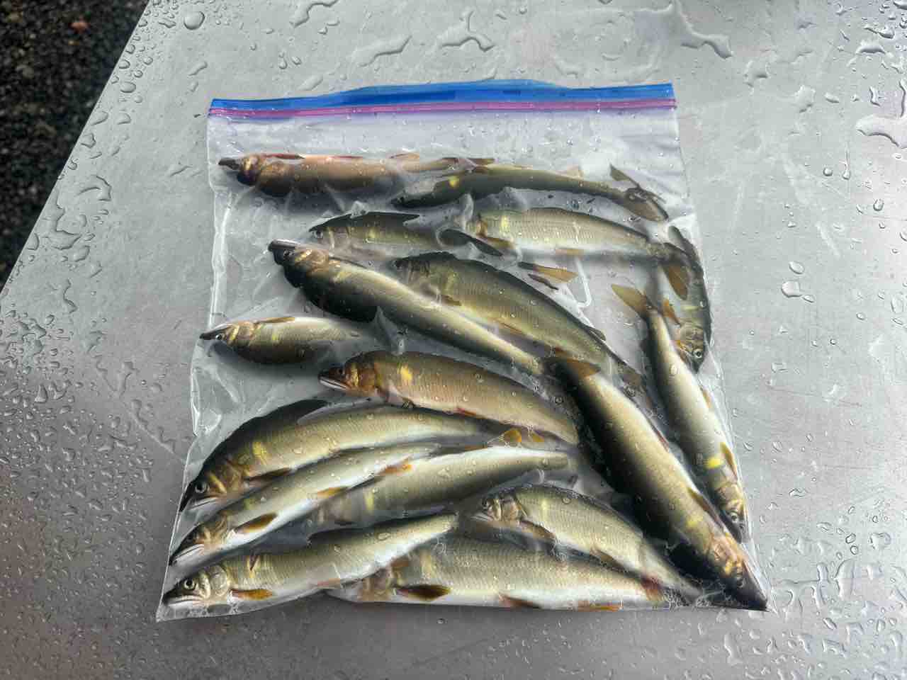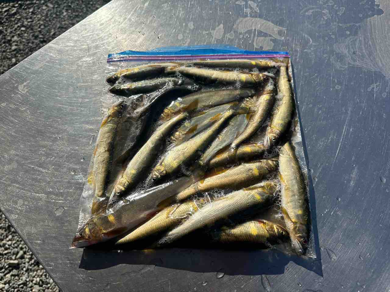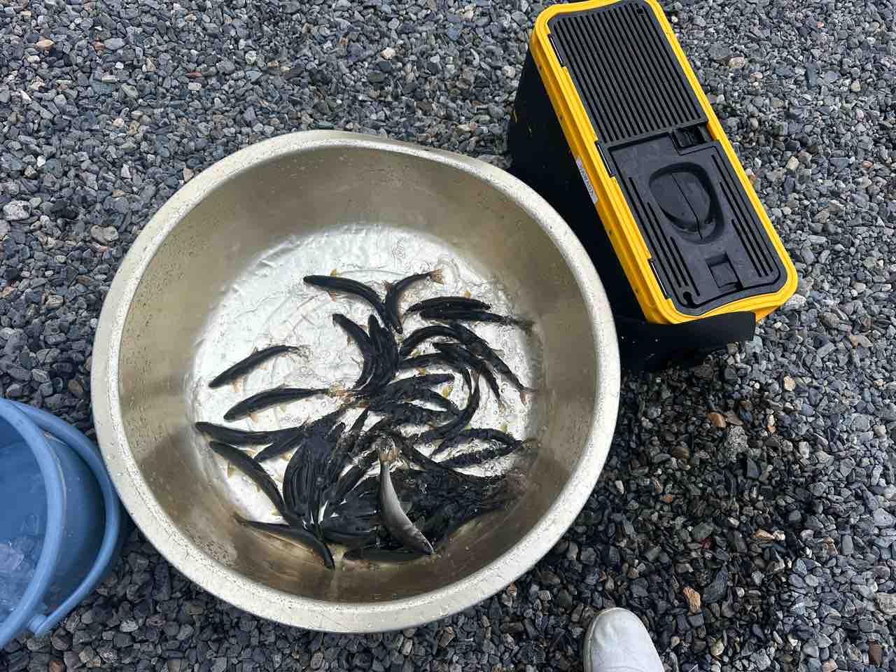 最後は小川あたりの岩盤やチャラ瀬狙いでぼちぼち釣れましたが、さすがに3連休の真ん中。