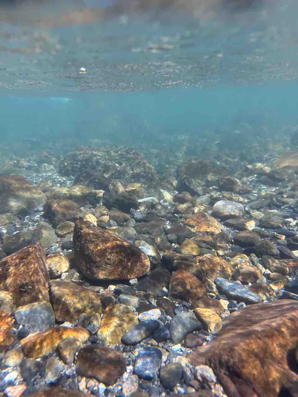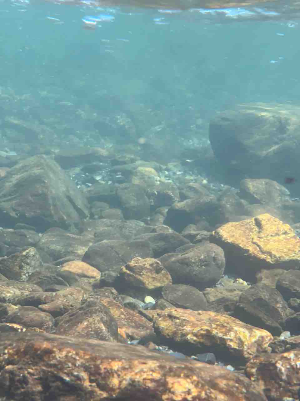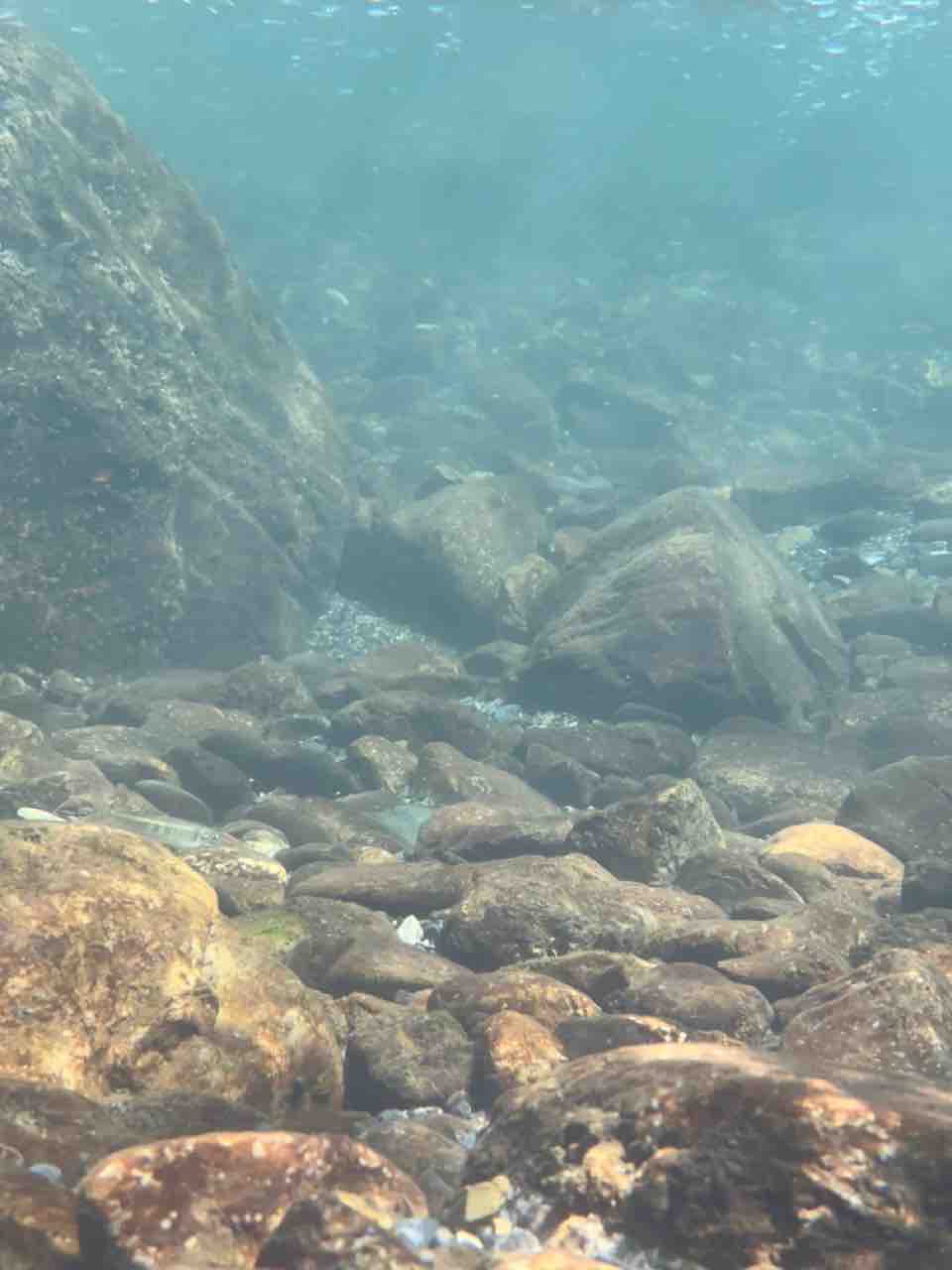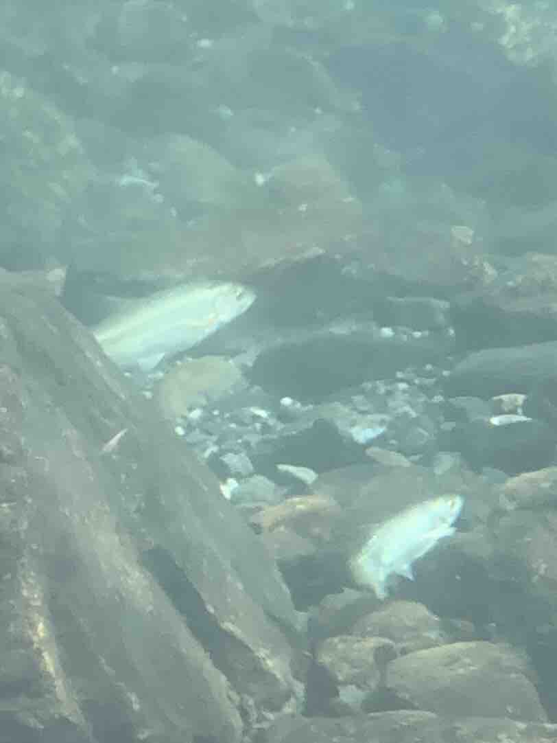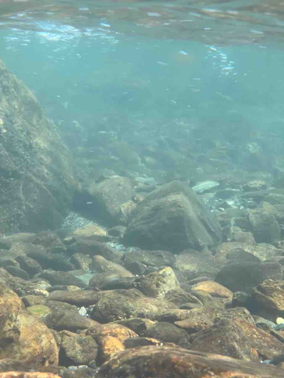 かなりの渇水でアユはたくさん見えますが、岩盤でも瀬でも仲良く群れてます。