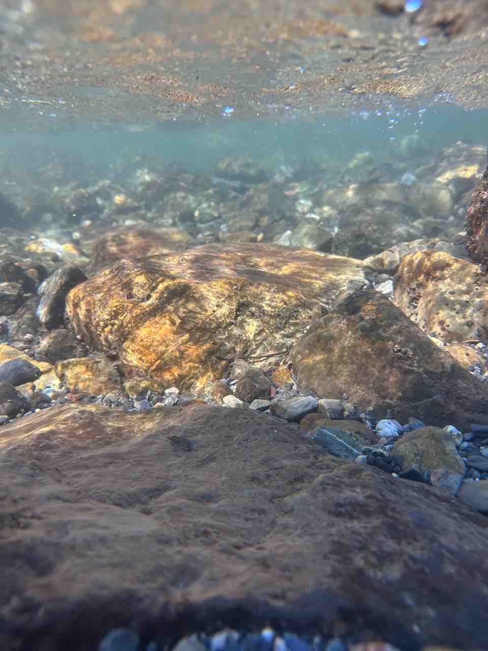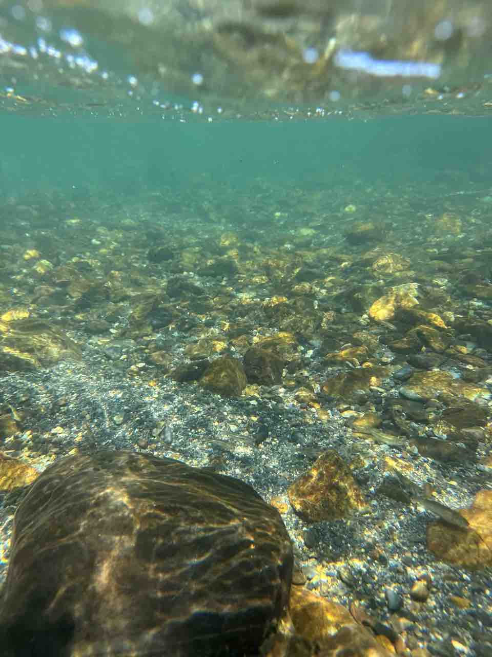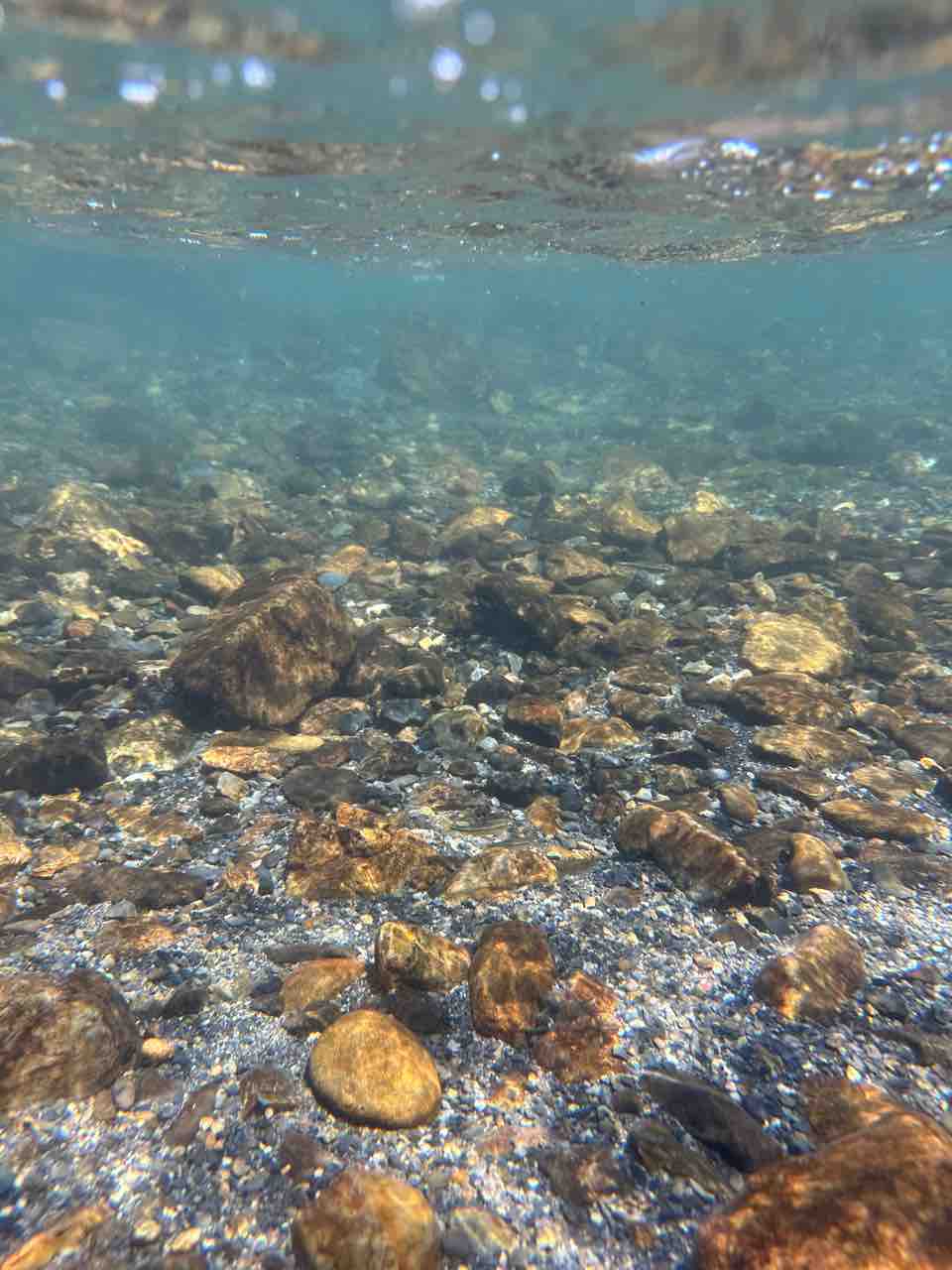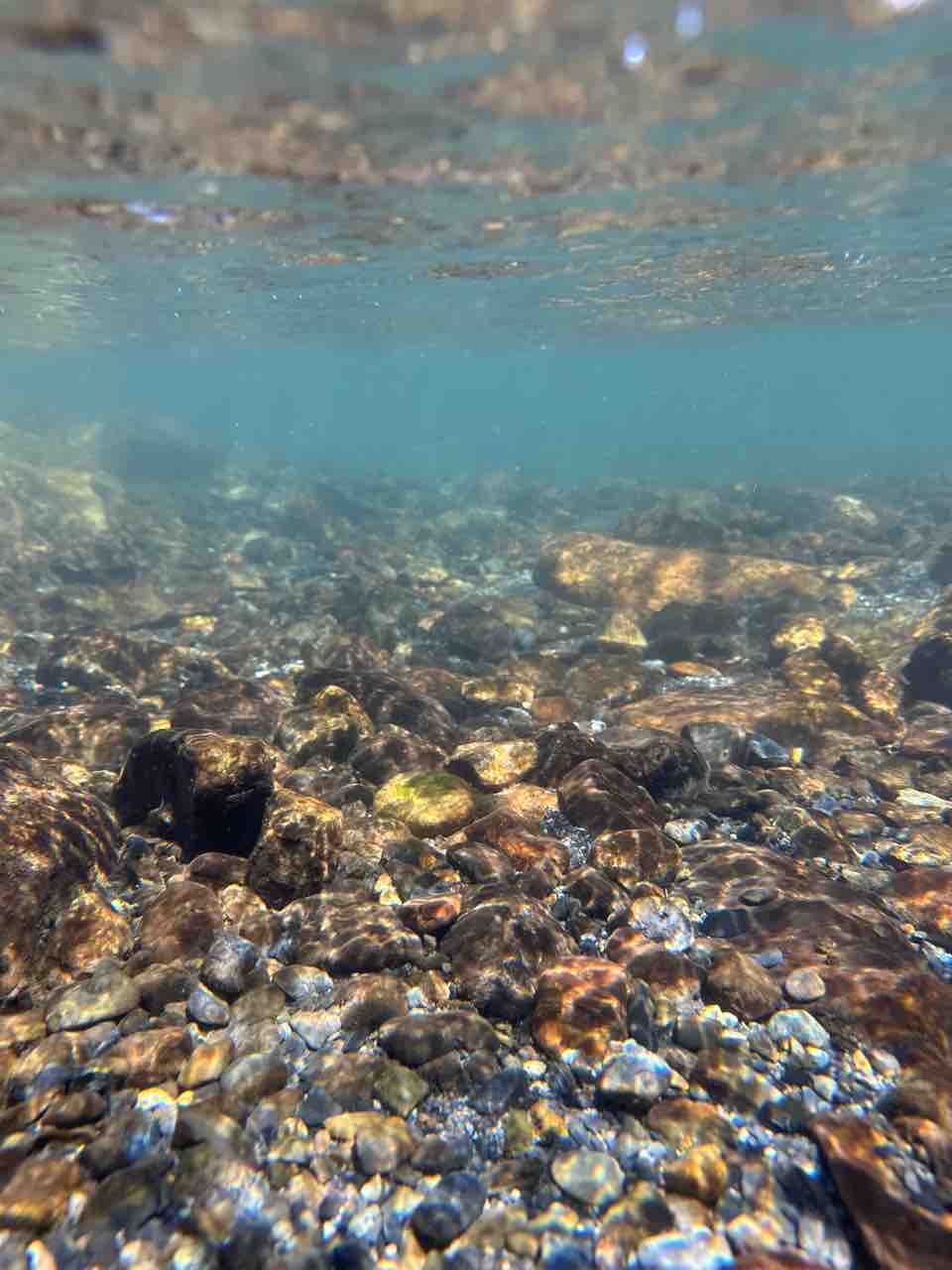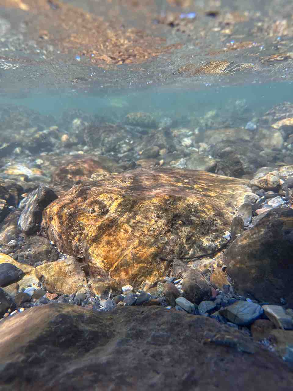 かなりの渇水でアユはたくさん見えますが、岩盤でも瀬でも仲良く群れてます。
