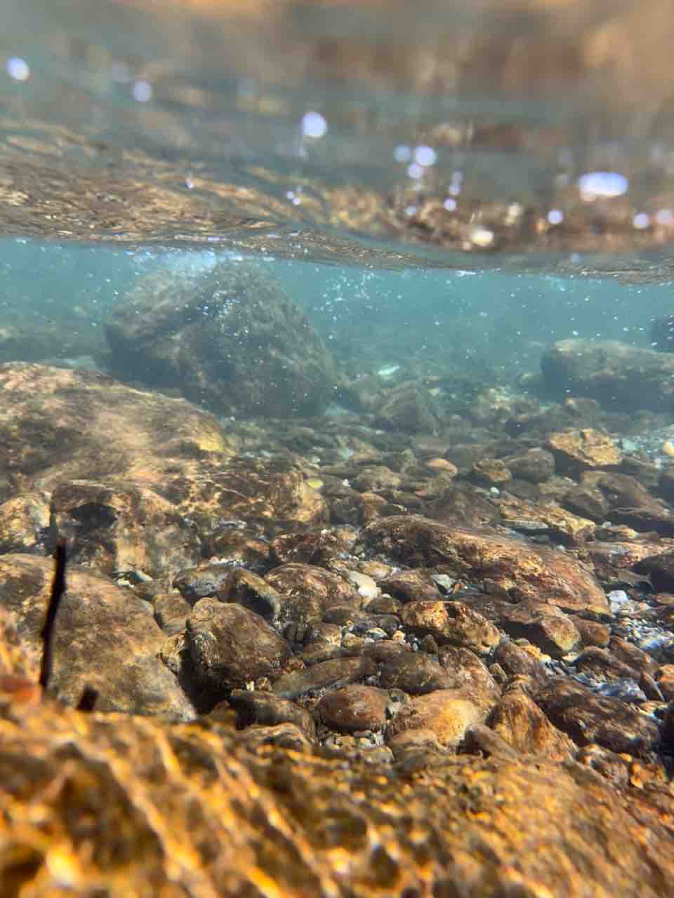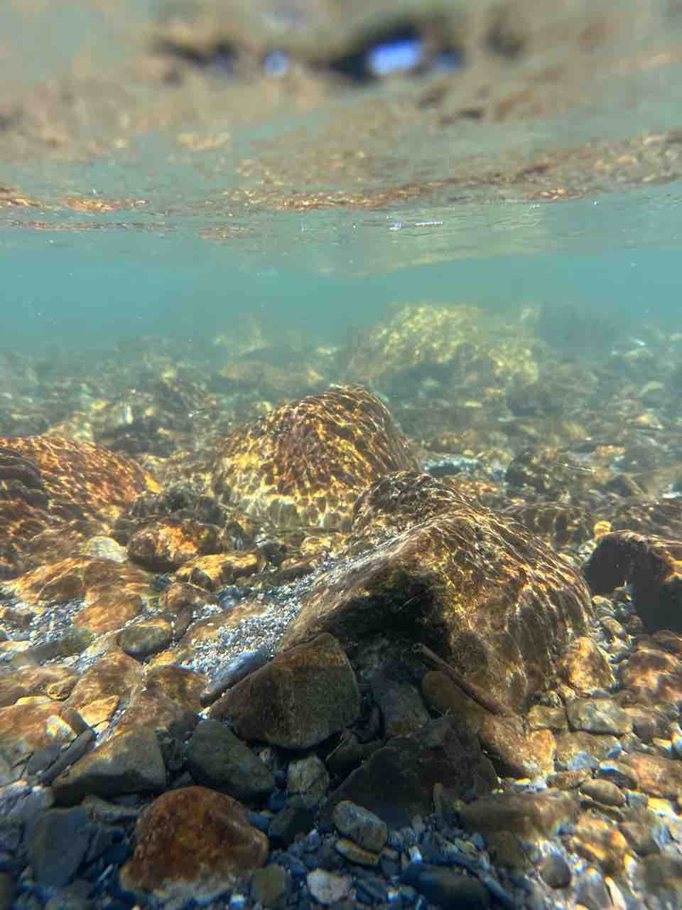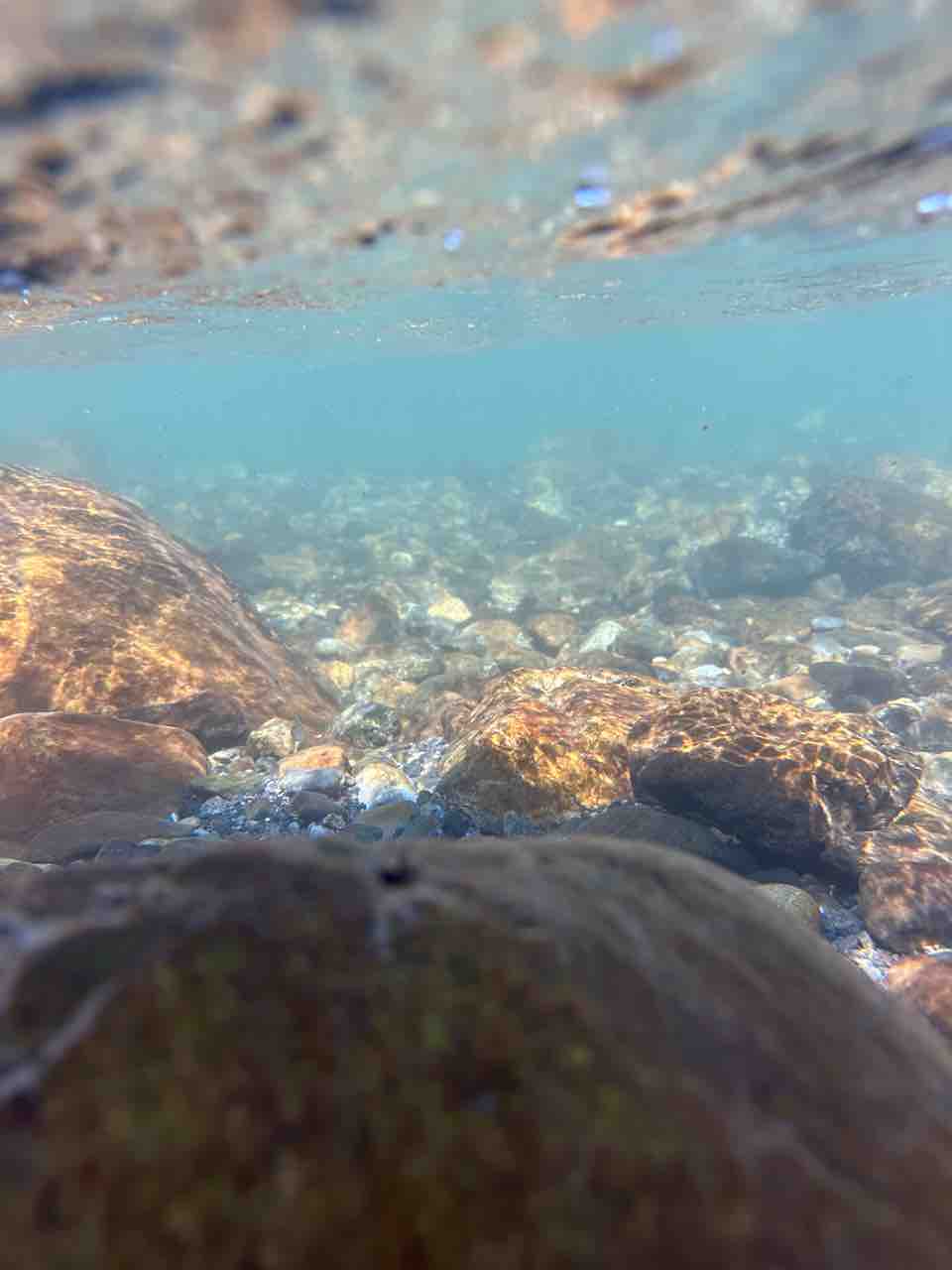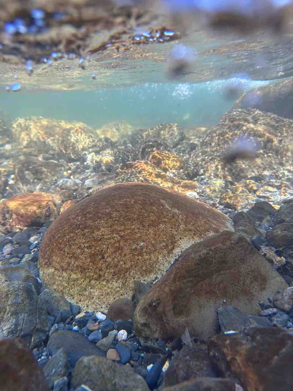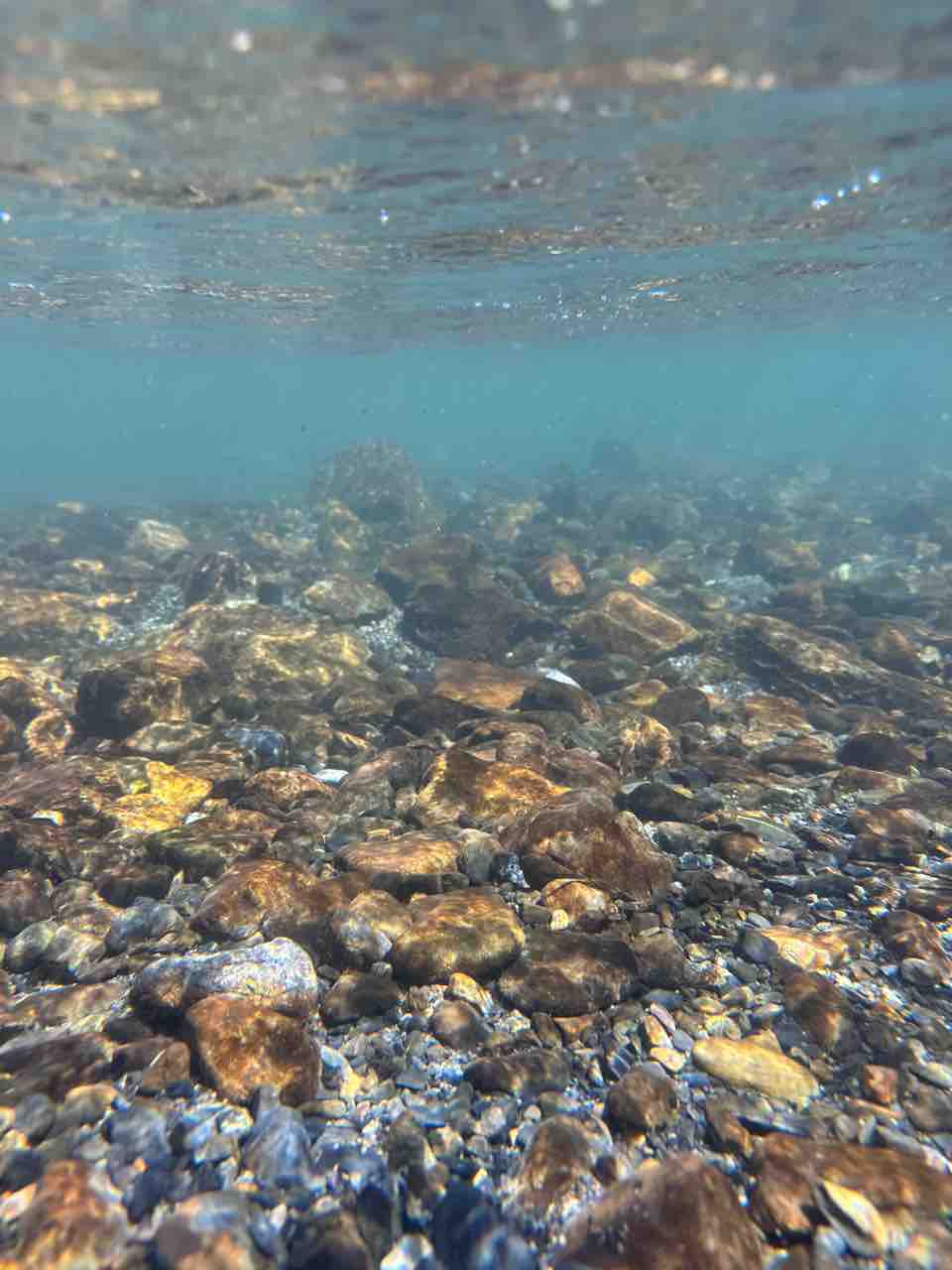 かなりの渇水でアユはたくさん見えますが、岩盤でも瀬でも仲良く群れてます。