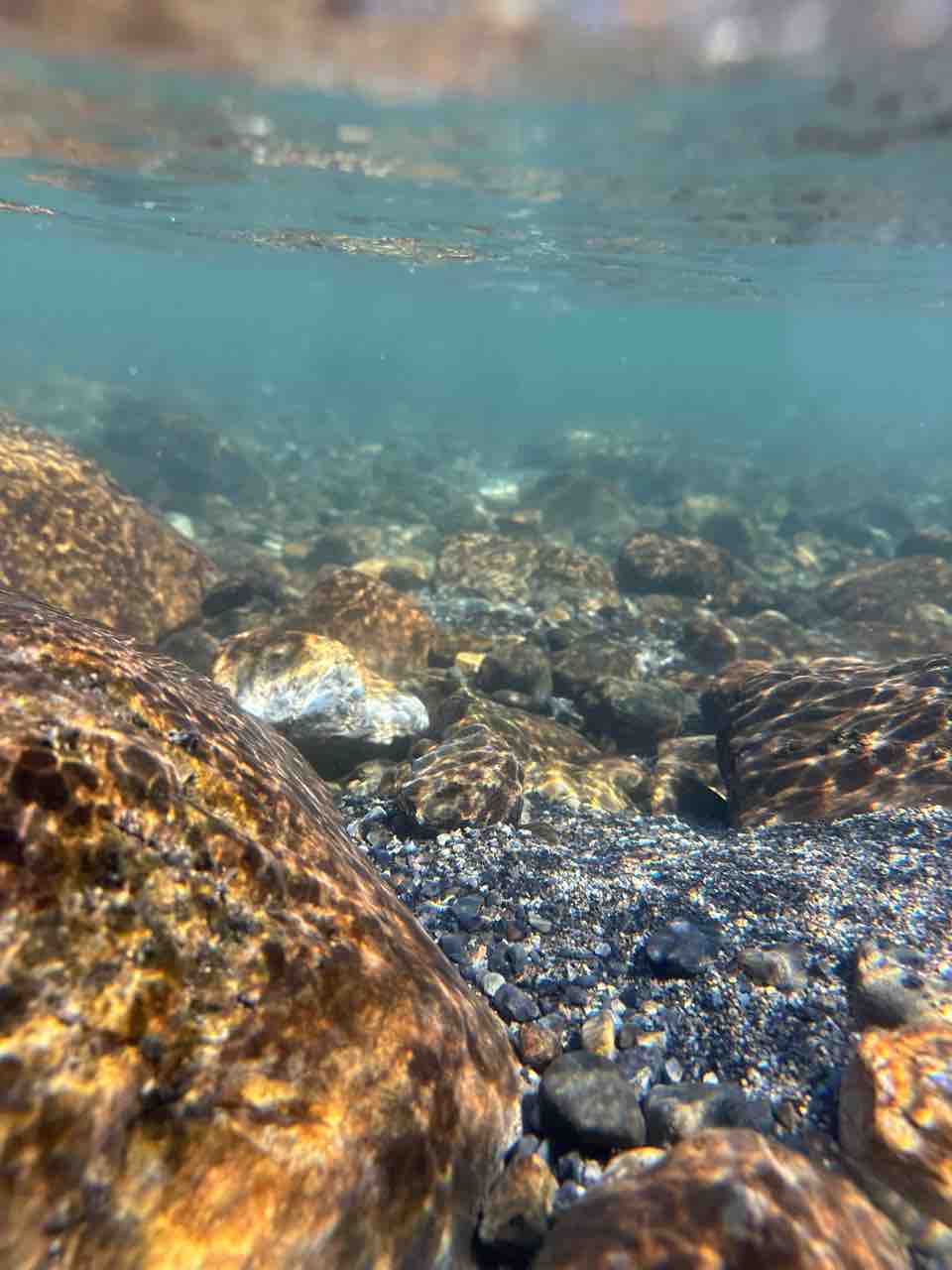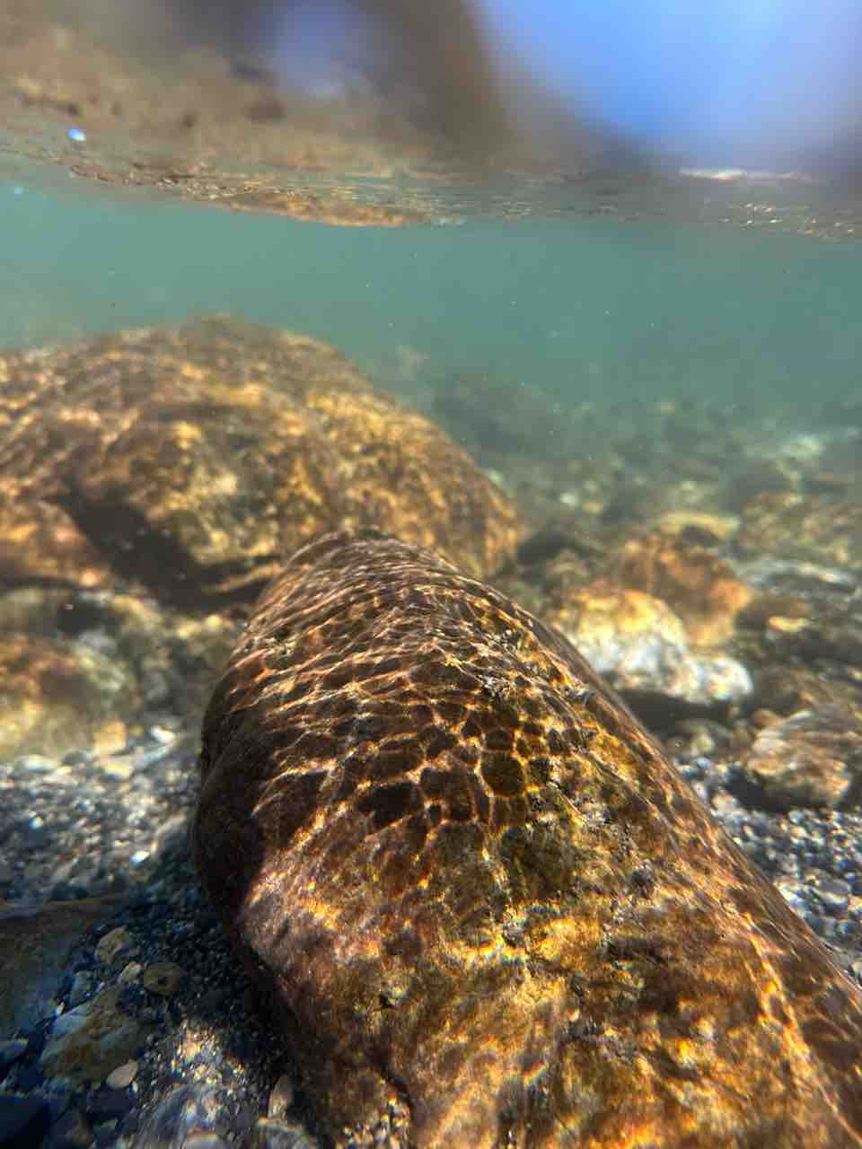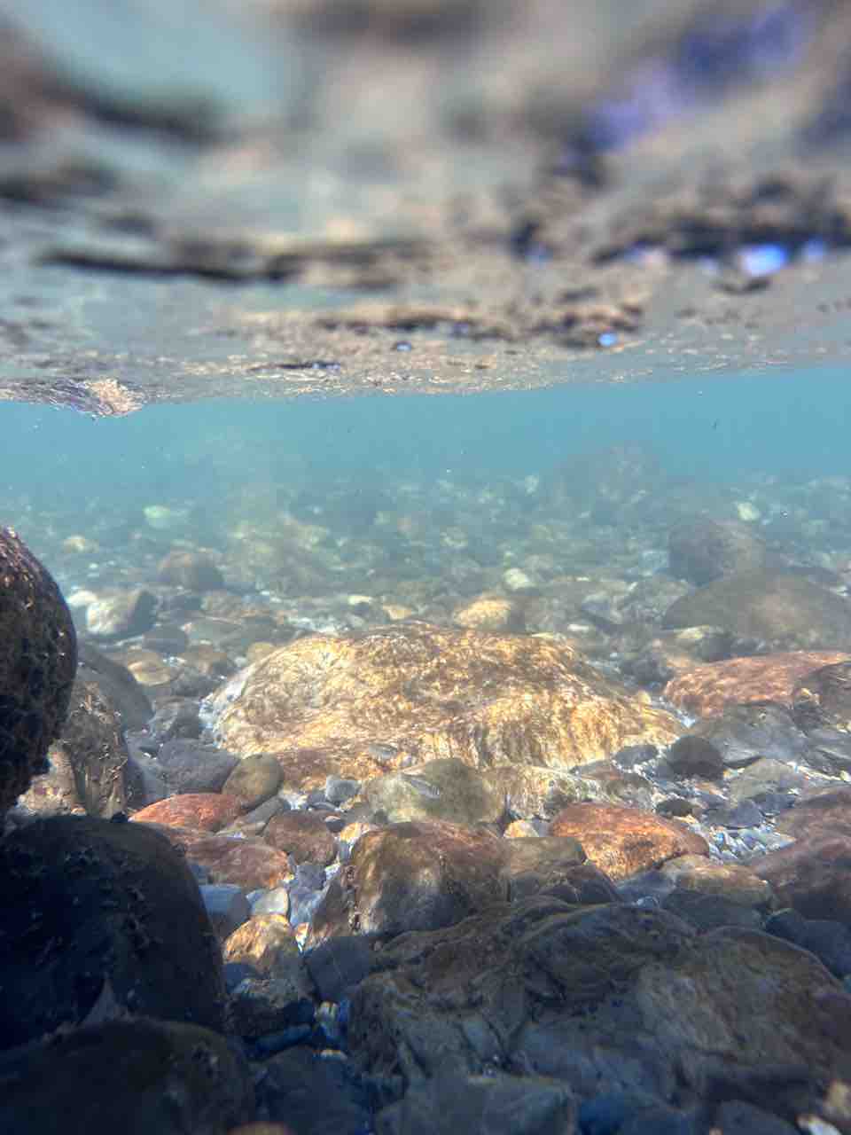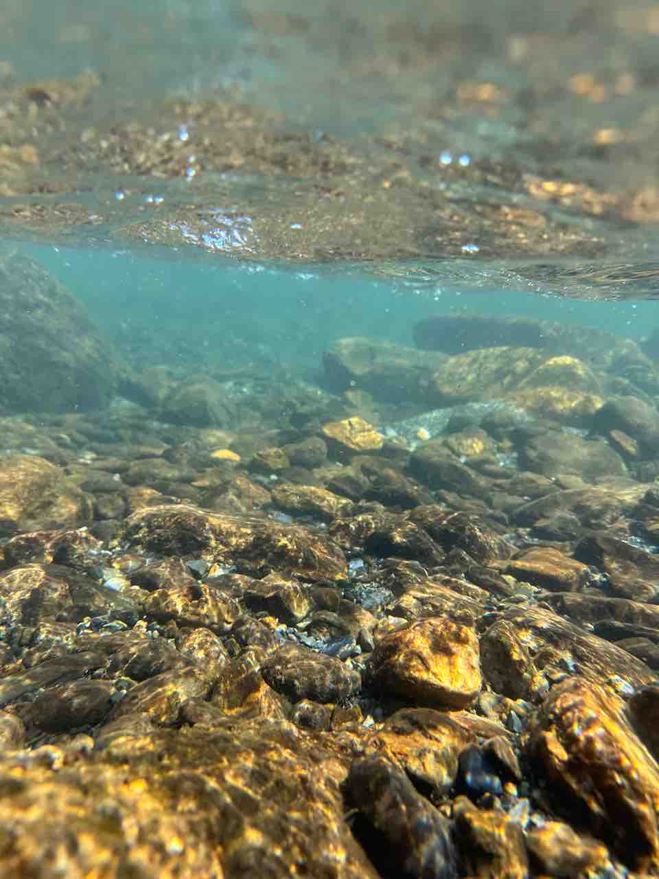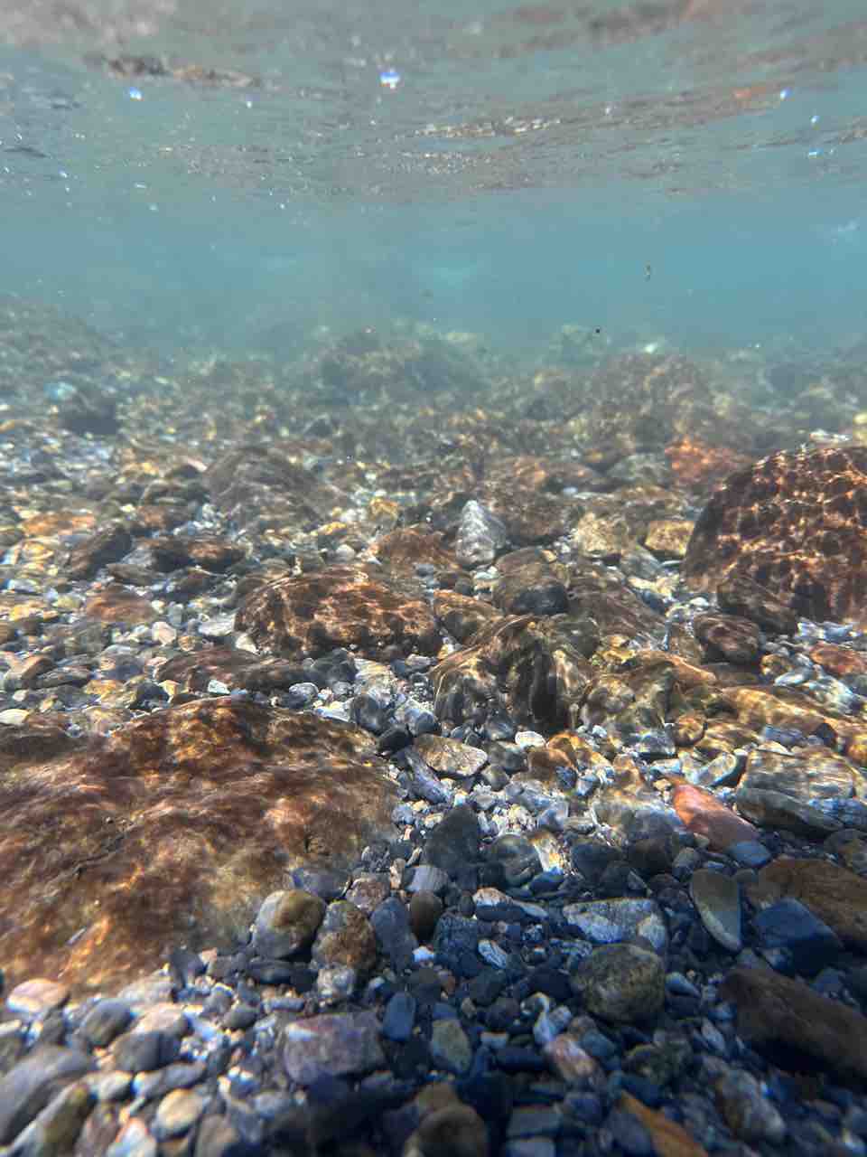 かなりの渇水でアユはたくさん見えますが、岩盤でも瀬でも仲良く群れてます。