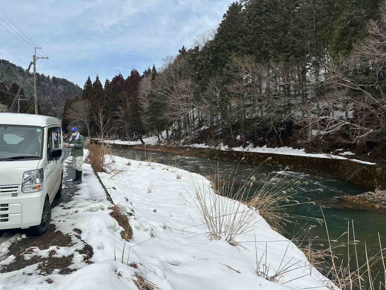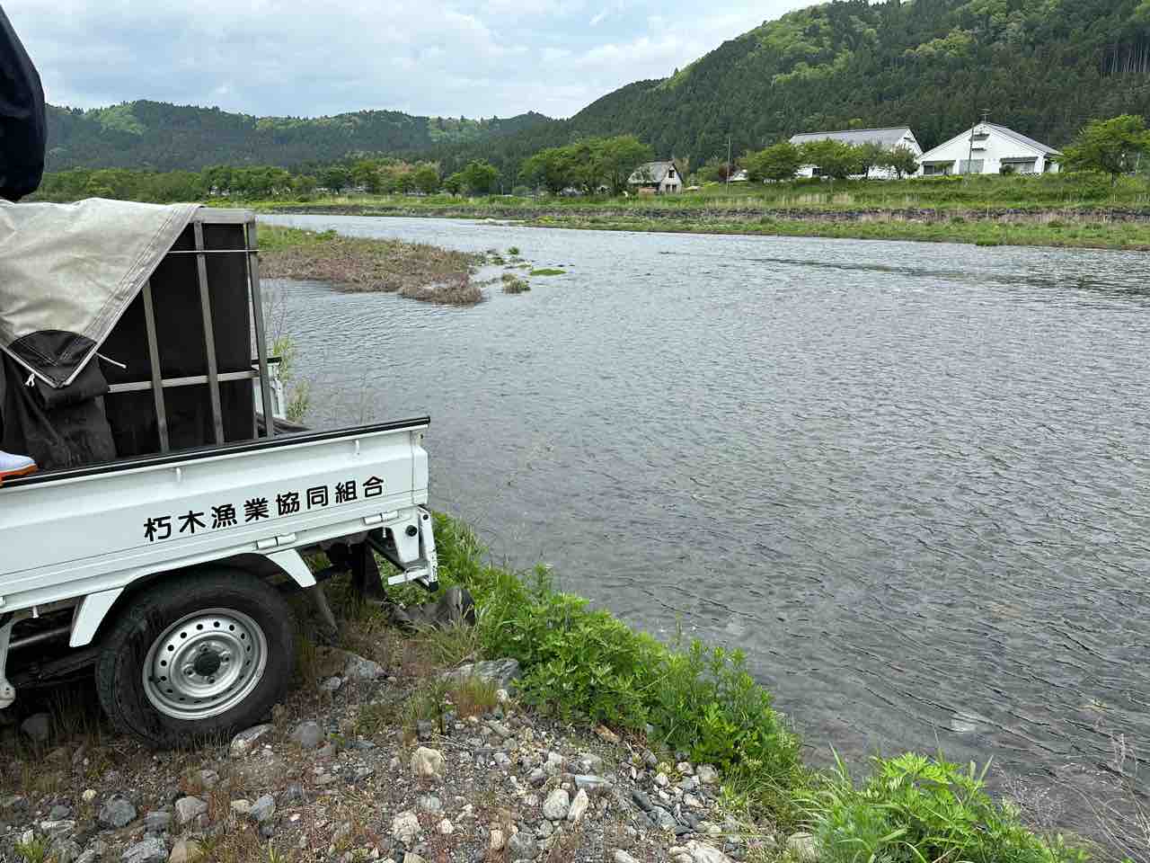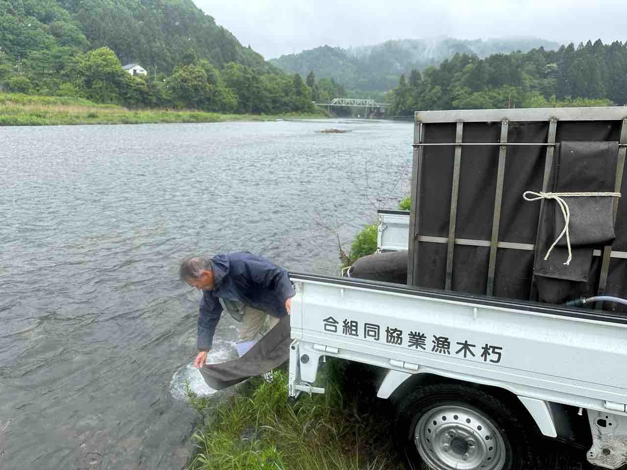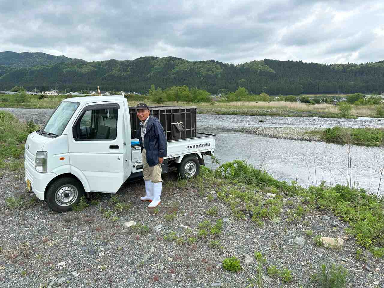 川村組合長は毎日漁協の軽トラでヤナ場と朽木をピストン輸送しています。