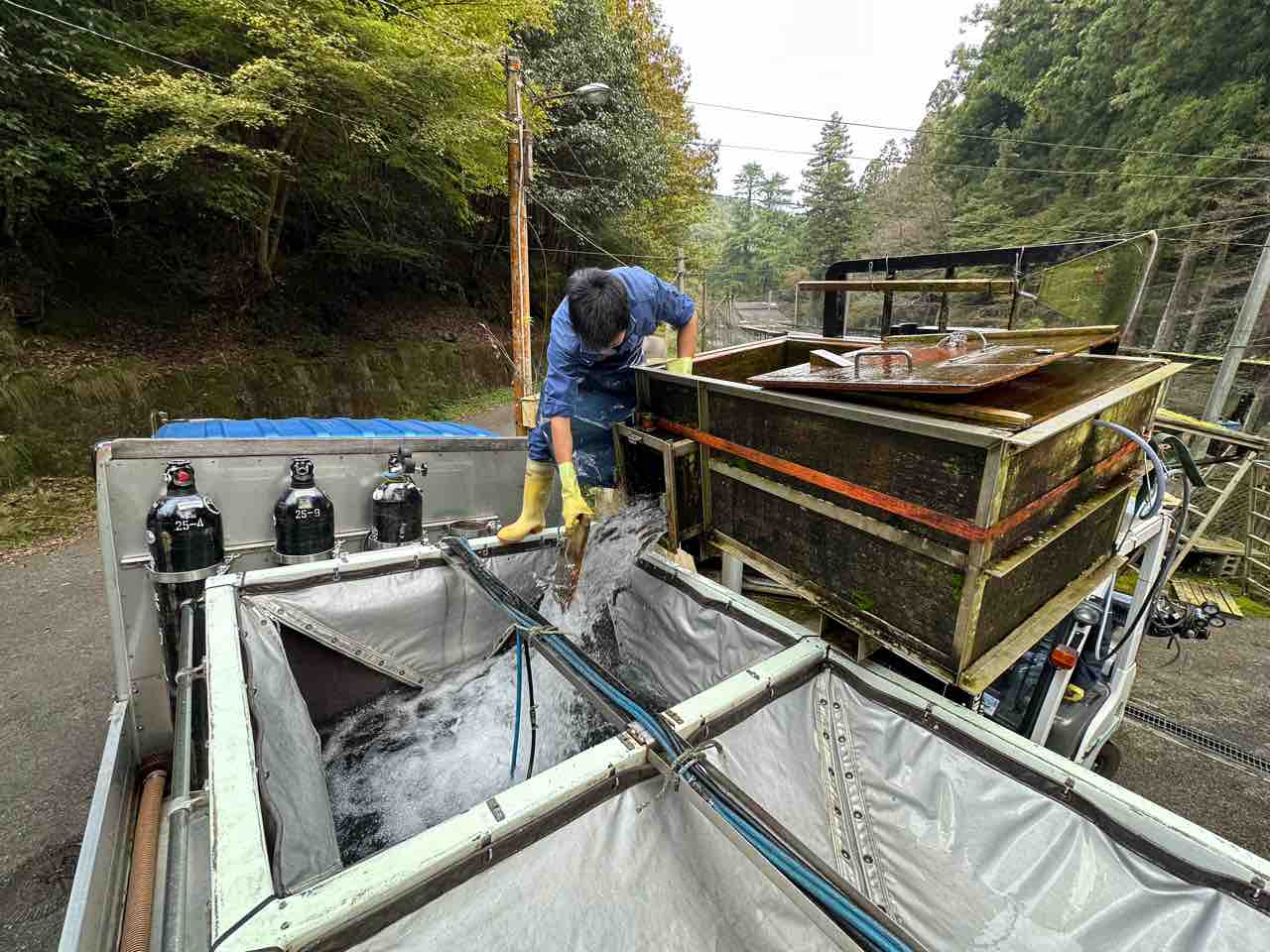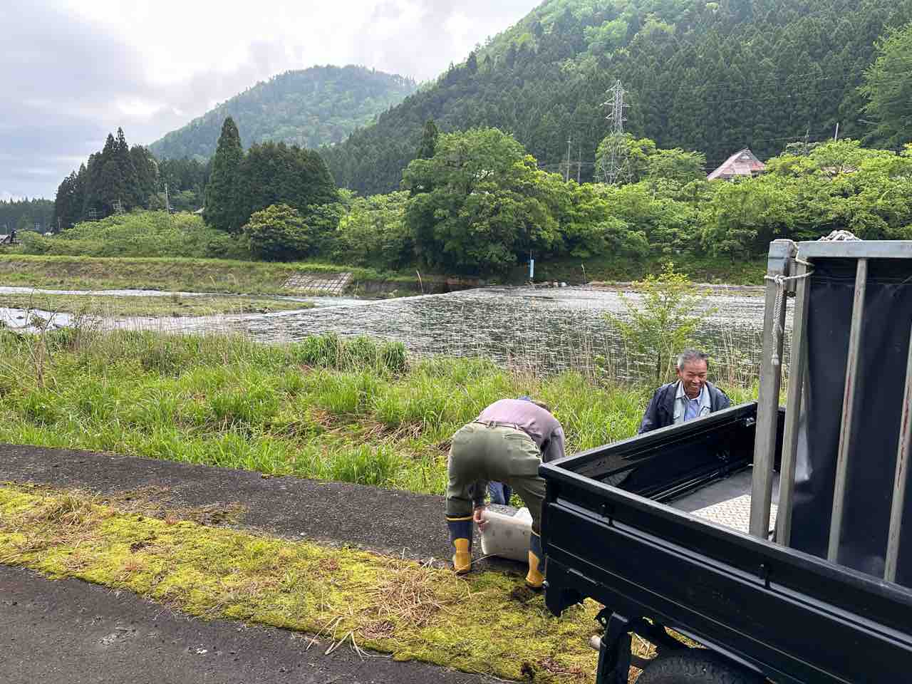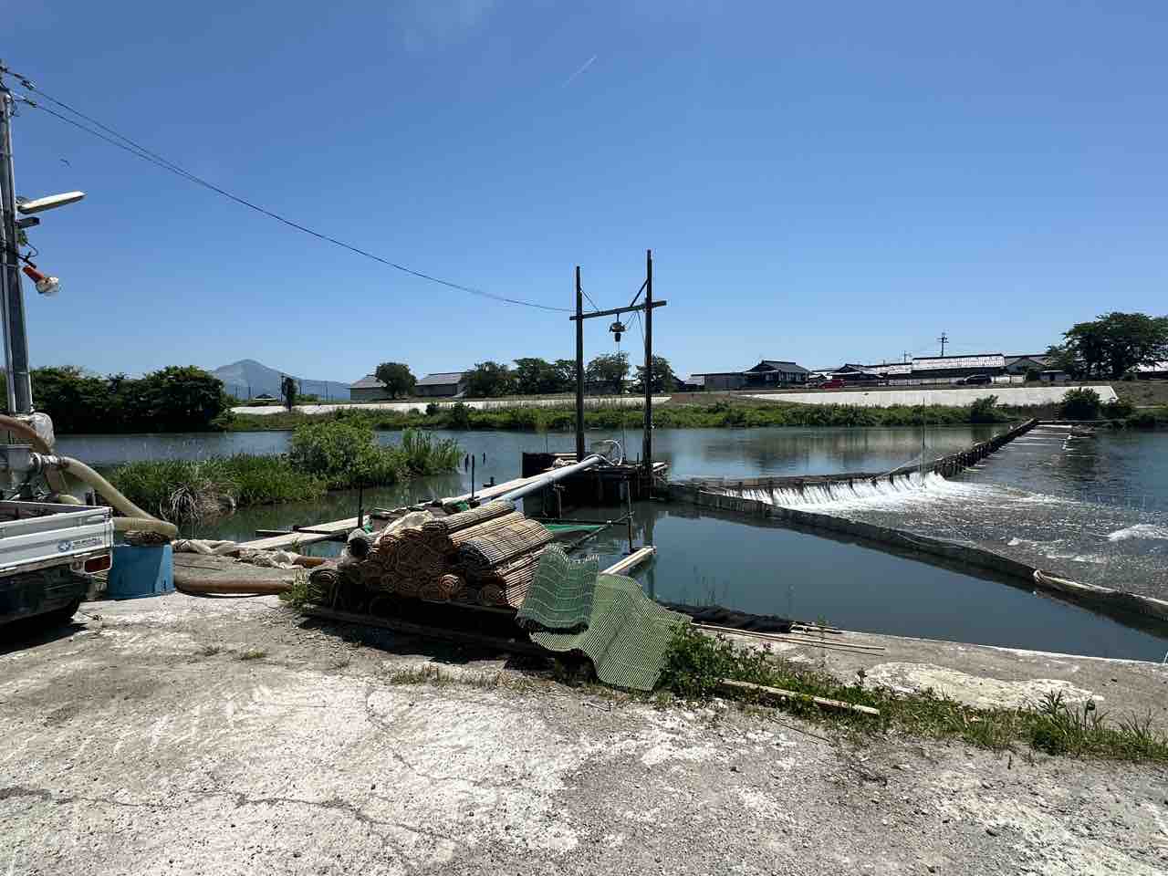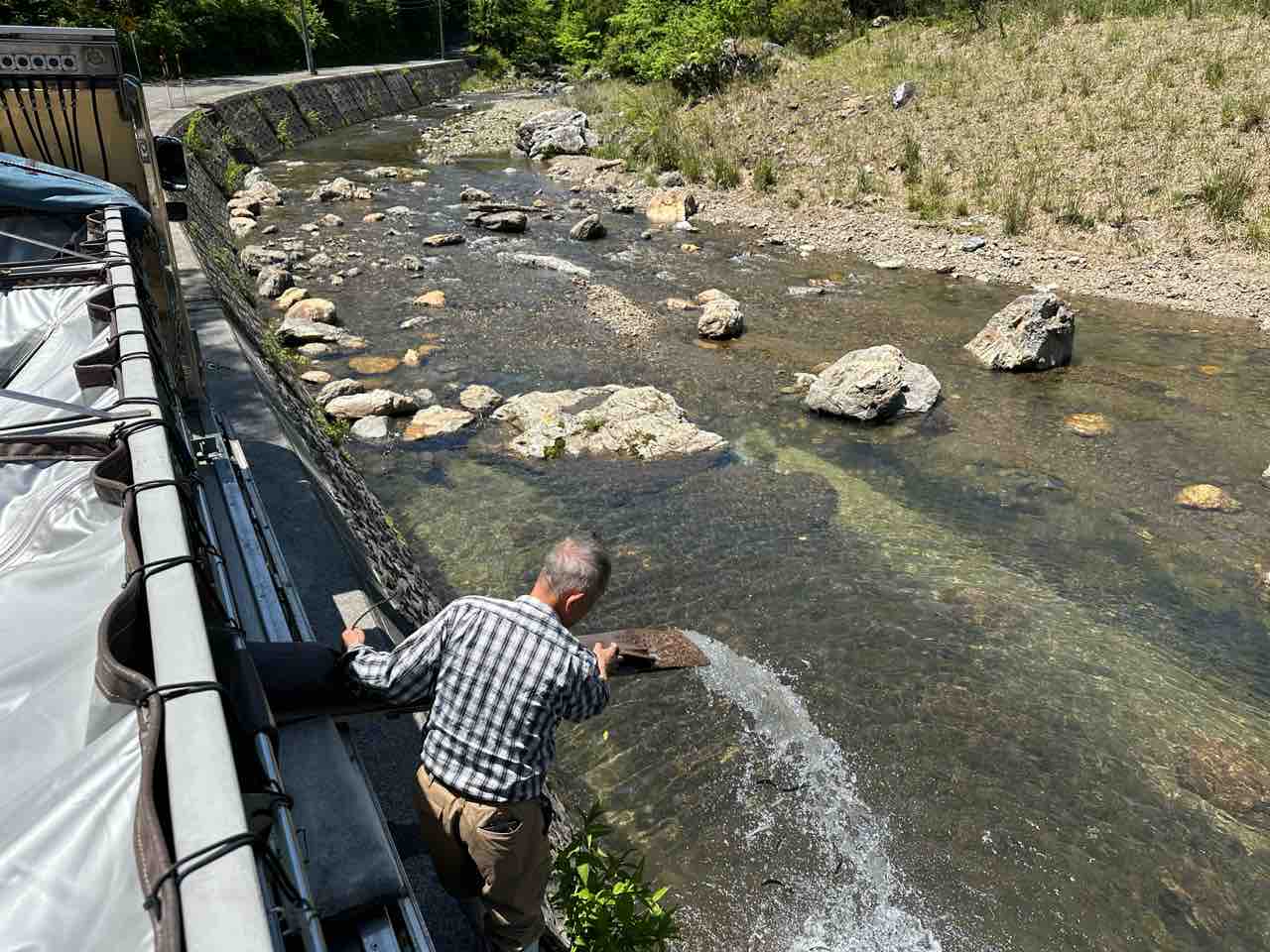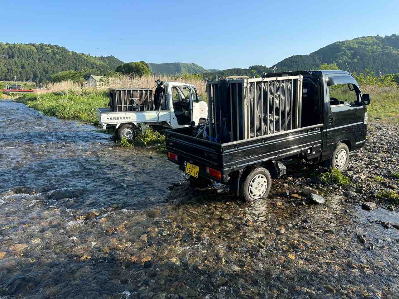 川村組合長は毎日漁協の軽トラでヤナ場と朽木をピストン輸送しています。