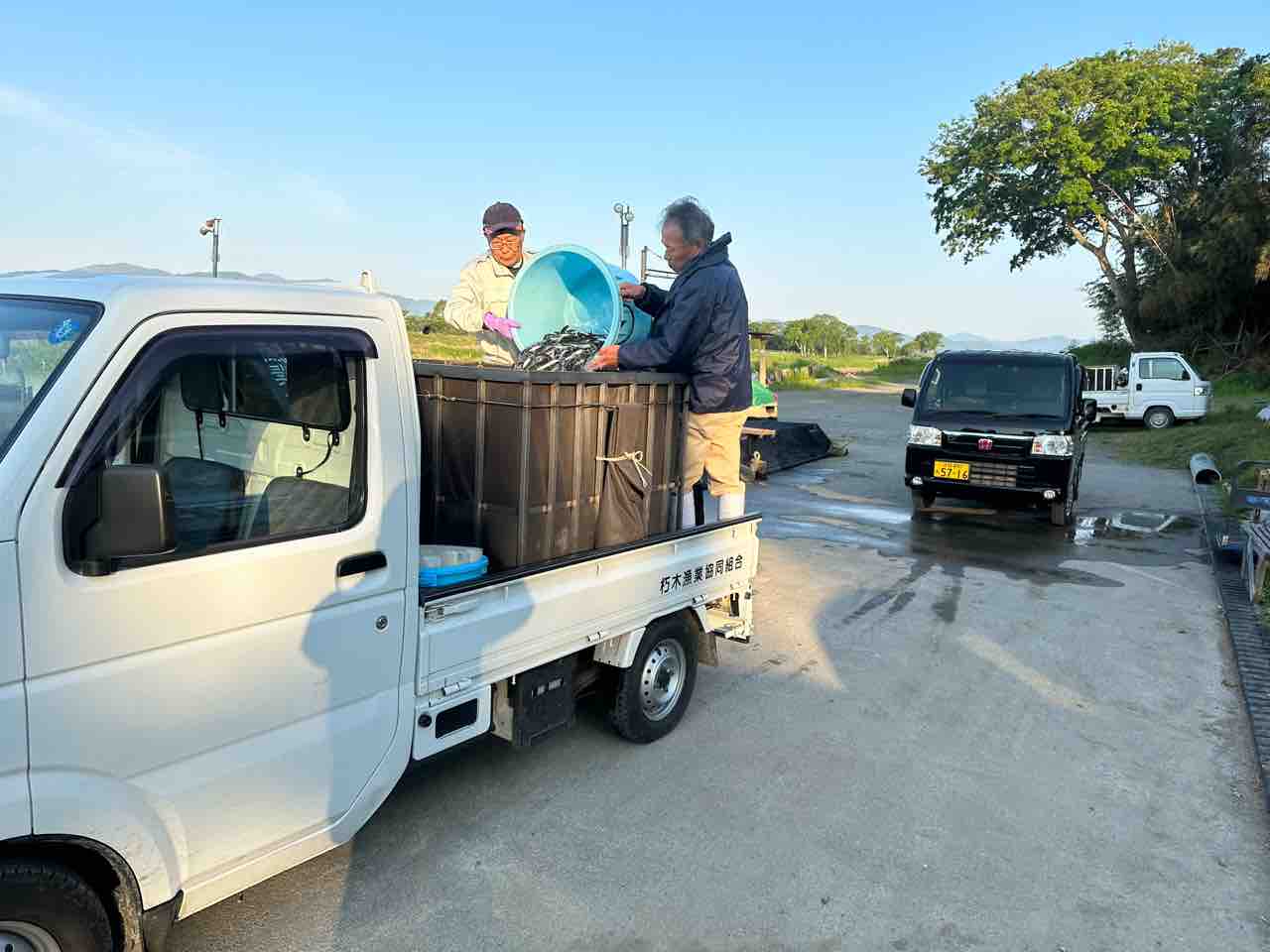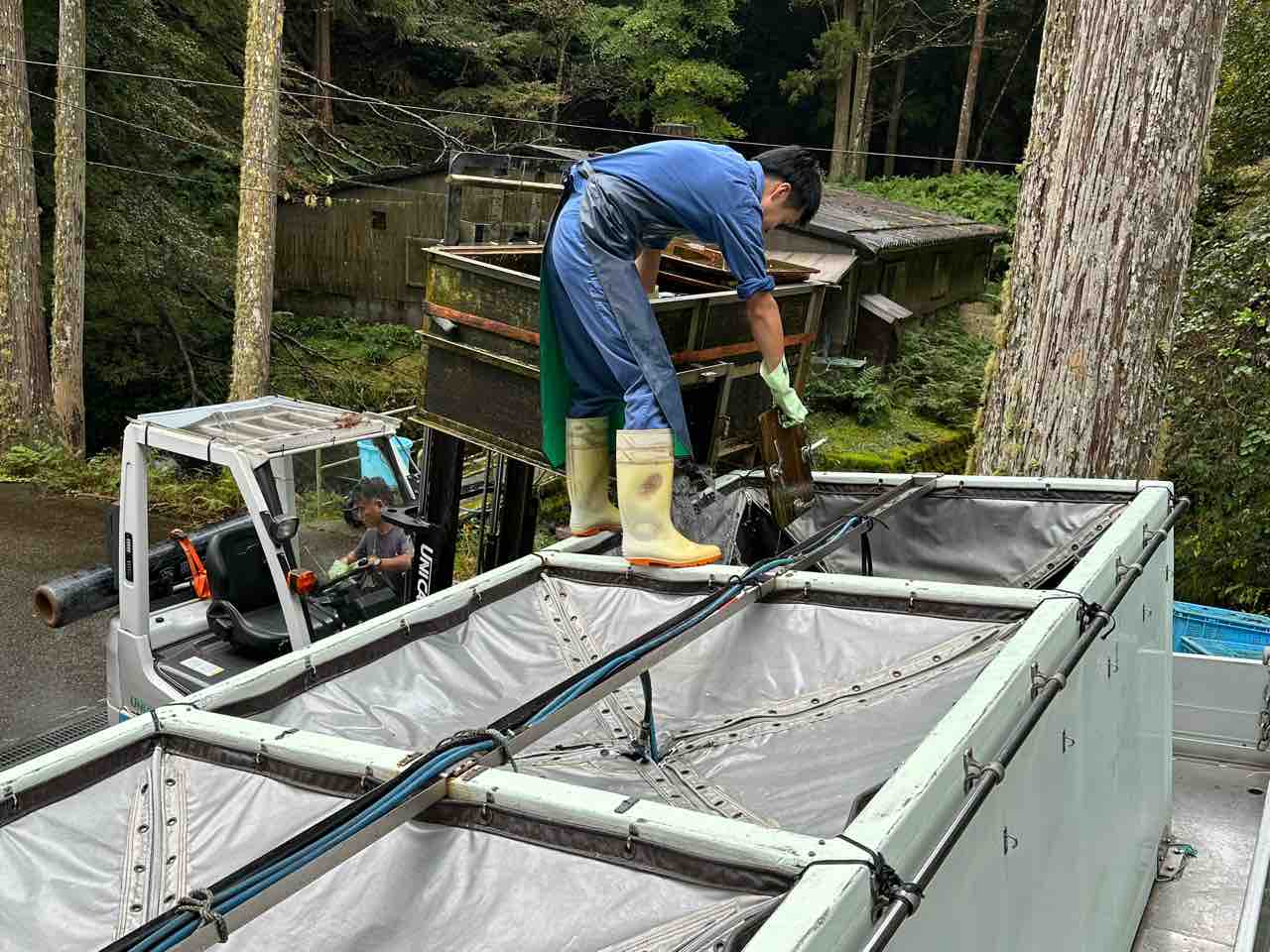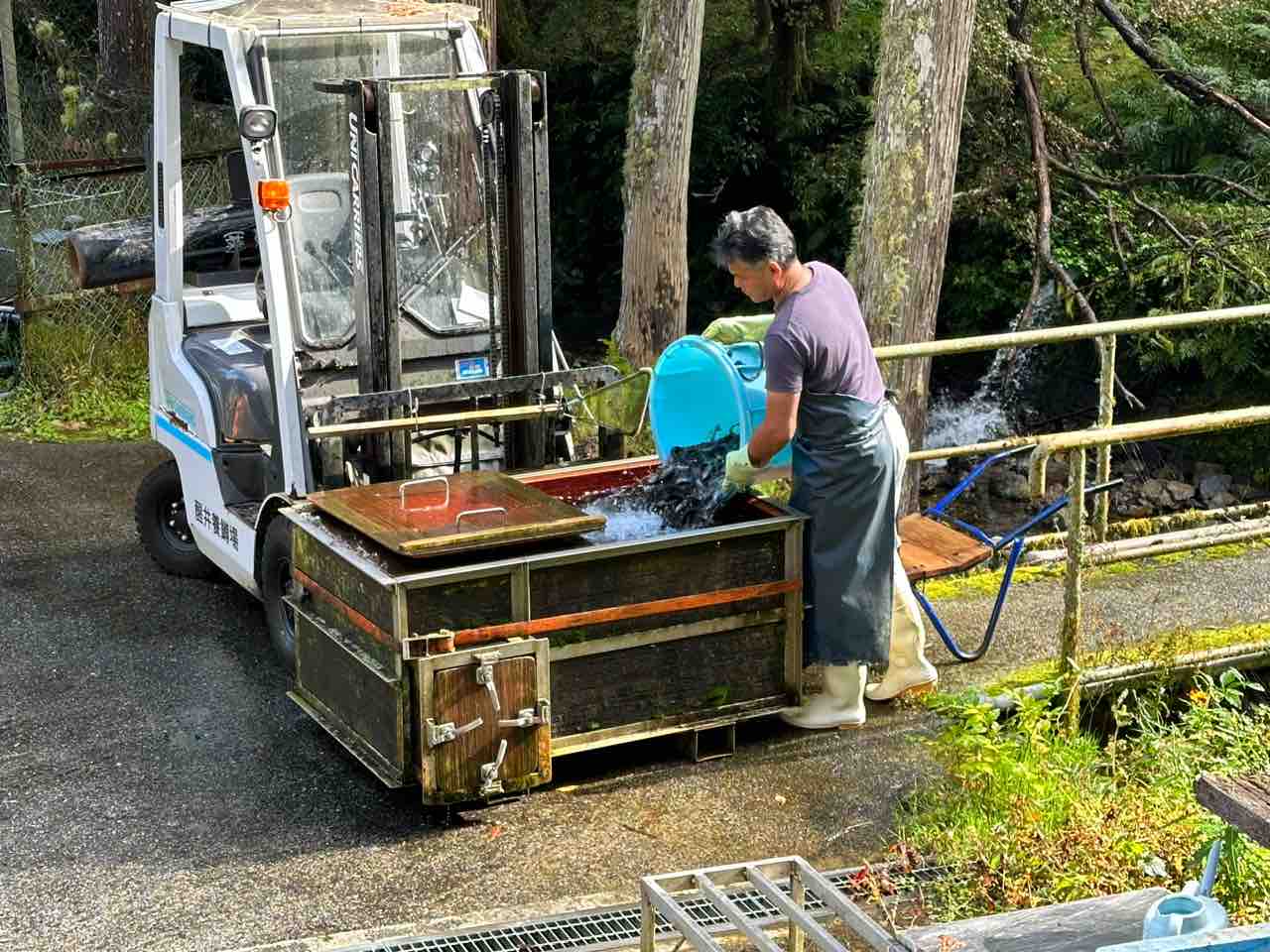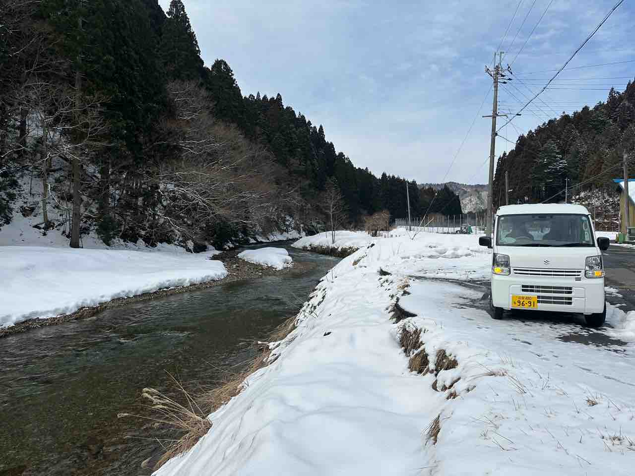 川村組合長は毎日漁協の軽トラでヤナ場と朽木をピストン輸送しています。